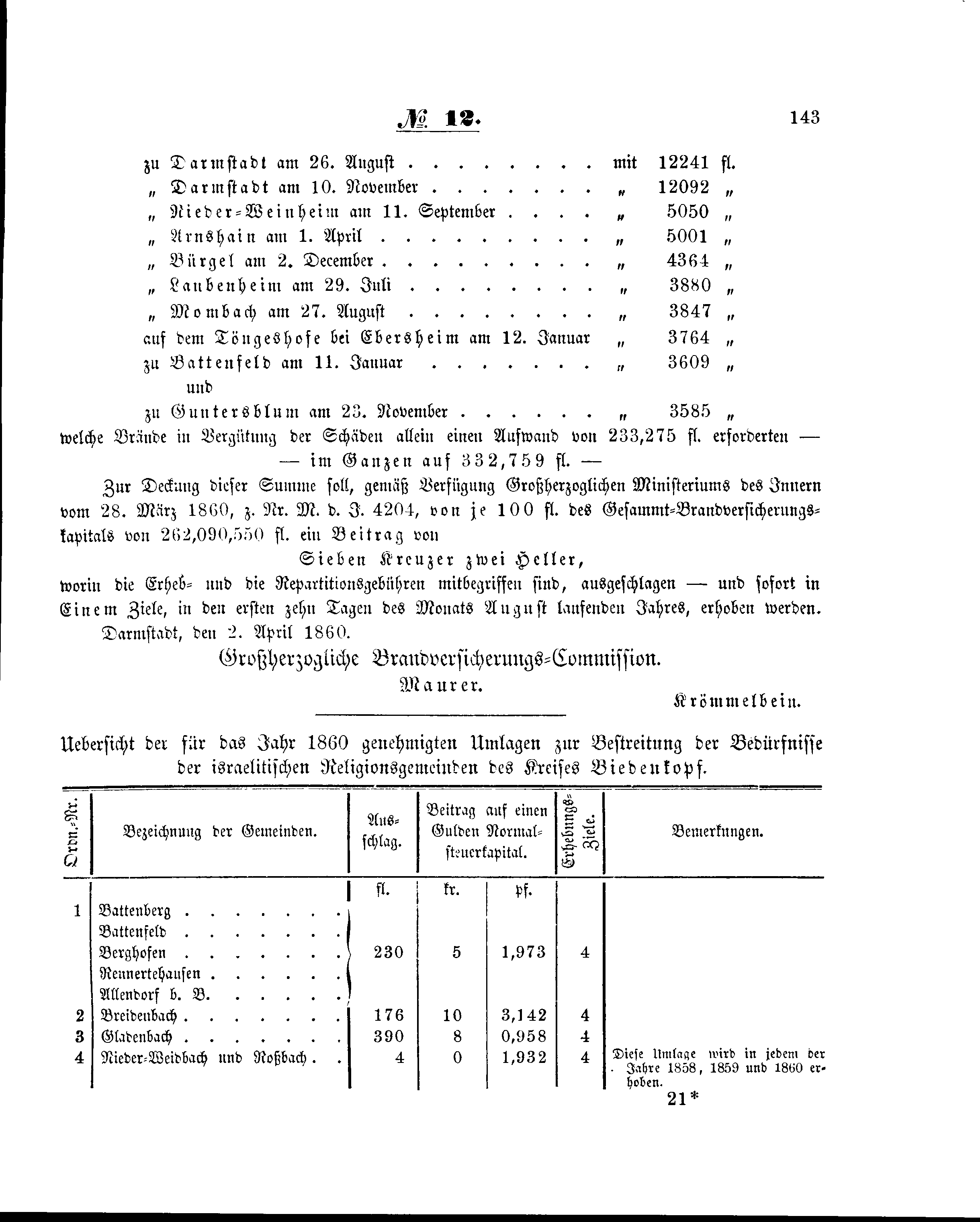 Zur Deckung dieser Summe soll, gemäß Verfügung Großherzoglichen Ministeriums des Innern vom 28. März 1860, z. Nr. M. d. J. 4204, von je 100 fl. des Gesammt-Brandversicherungskapitals von 262,090,550 fl. ein Beitrag von