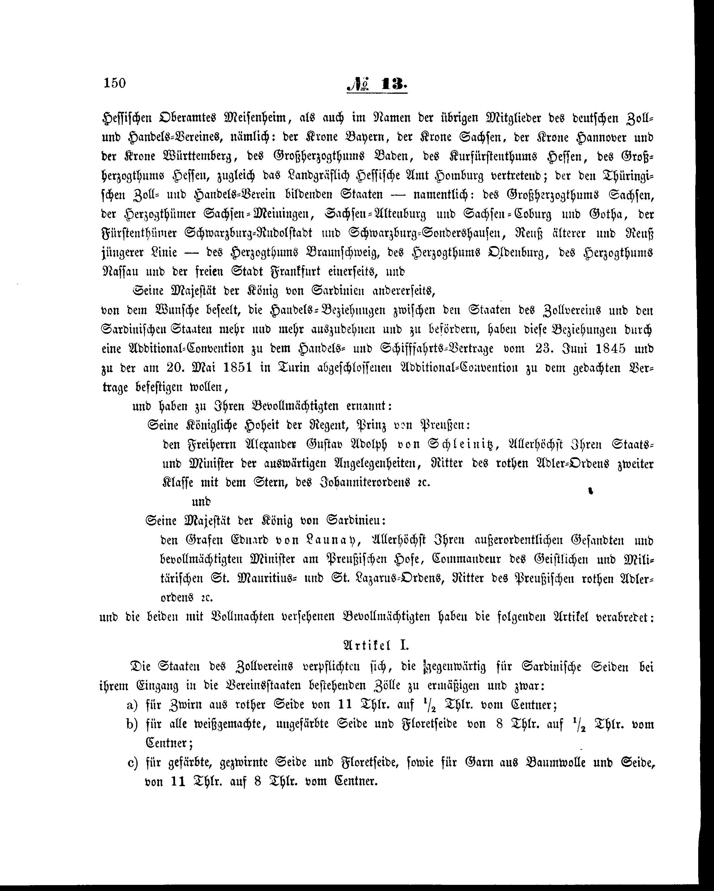 von dem Wunsche beseelt, die Handels-Beziehungen zwischen den Staaten des Zollvereins und den Sardinischen Staaten mehr und mehr auszudehnen und zu befördern, haben diese Beziehungen durch eine Additional-Convention zu dem Handels- und Schifffahrts-Vertrage vom 23. Juni 1845 und zu der am 20. Mai 1851 in Turin abgeschlossenen Additional-Convention zu dem gedachten Vertrage befestigen wollen,