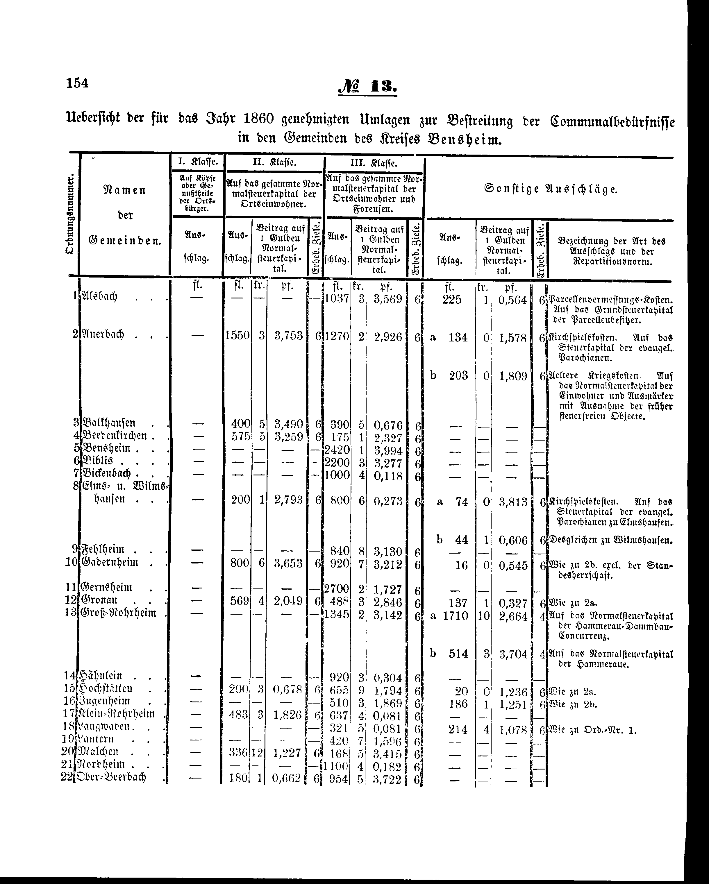 Uebersicht der für das Jahr 1860 genehmigten Umlagen zur Bestreitung der Communalbedürfnisse in den Gemeinden des Kreises Bensheim.