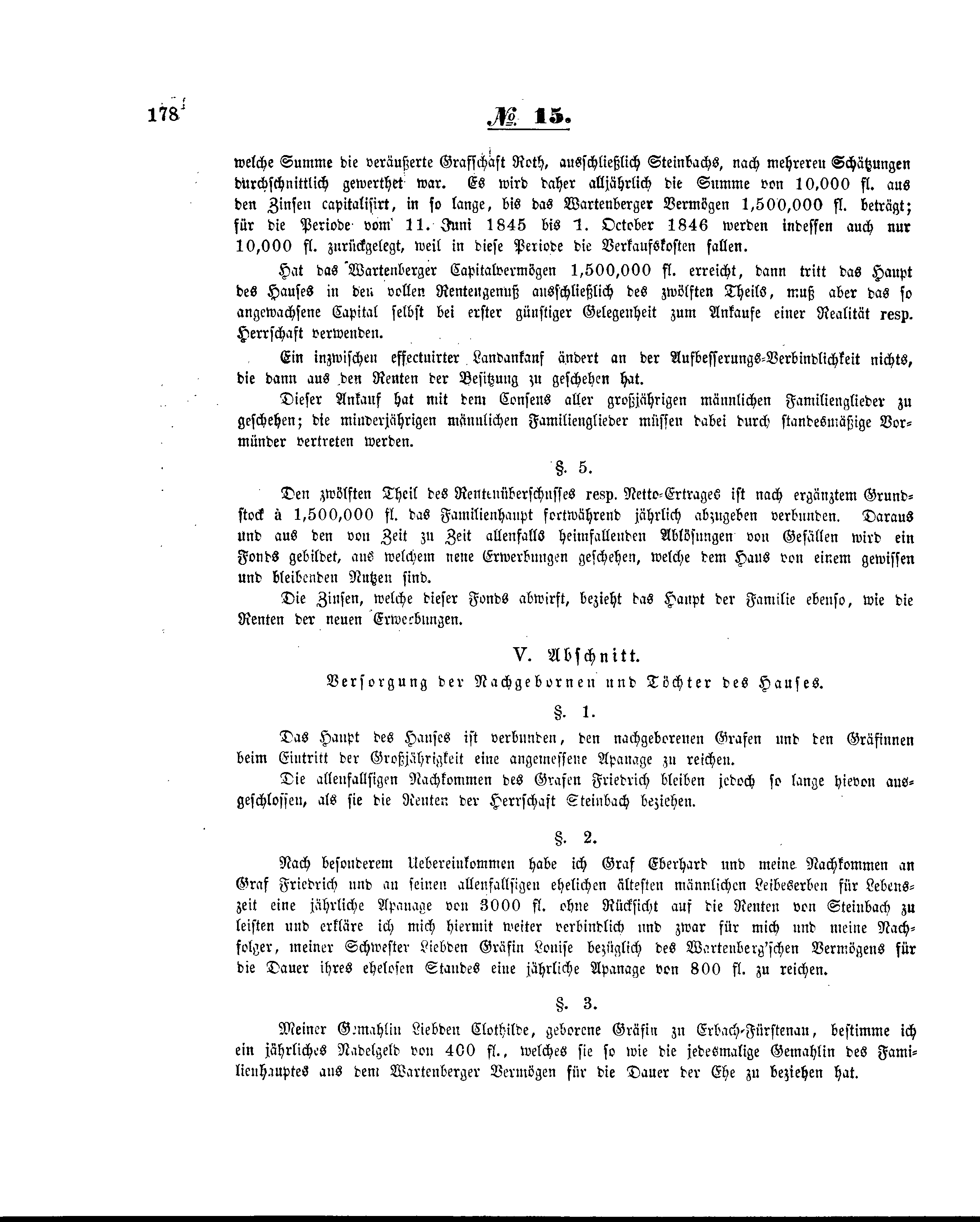 Hat das Wartenberger Capitalvermögen 1,500,000 fl. erreicht, dann tritt das Haupt des Hauses in den vollen Rentengenuß ausschließlich des zwölften Theils, muß aber das so angewachsene Capital selbst bei erster günstiger Gelegenheit zum Ankaufe einer Realität resp. Herrschaft verwenden.