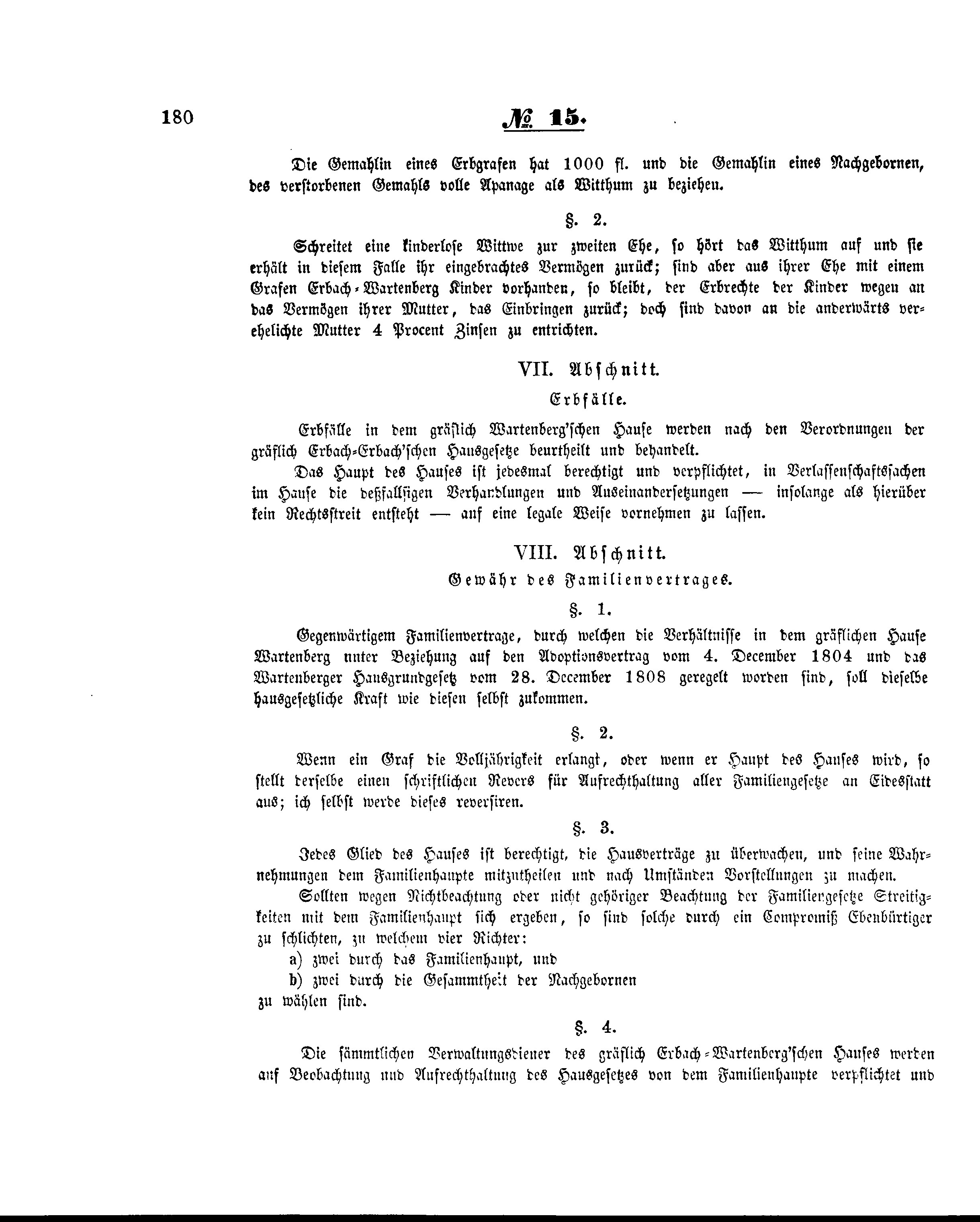 Gegenwärtigem Familienvertrage, durch welchen die Verhältnisse in dem gräflichen Hause Wartenberg unter Beziehung auf den Adoptionsvertrag vom 4. December 1804 und das Wartenberger Hausgrundgesetz vom 28. December 1808 geregelt worden sind, soll dieselbe hausgesetzliche Kraft wie diesen selbst zukommen.