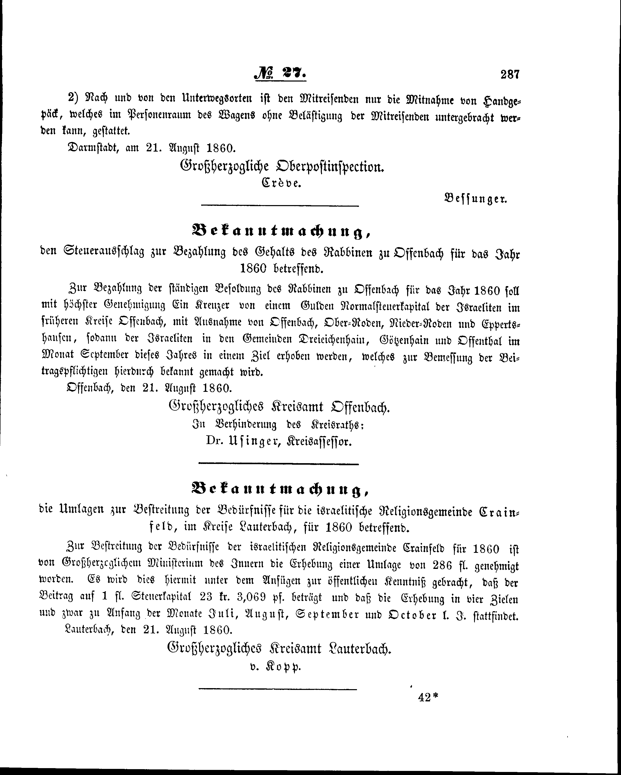 Zur Bezahlung der ständigen Besoldung des Rabbinen zu Offenbach für das Jahr 1860 soll mit höchster Genehmigung Ein Kreuzer von einem Gulden Normalsteuerkapital der Israeliten im früheren Kreise Offenbach, mit Ausnahme von Offenbach, Ober-Roden, Nieder-Roden und Eppertshausen, sodann der Israeliten in den Gemeinden Dreieichenhain, Götzenhain und Offenthal im Monat September dieses Jahres in einem Ziel erhoben werden, welches zur Bemessung der Beitragspflichtigen hierdurch bekannt gemacht wird.