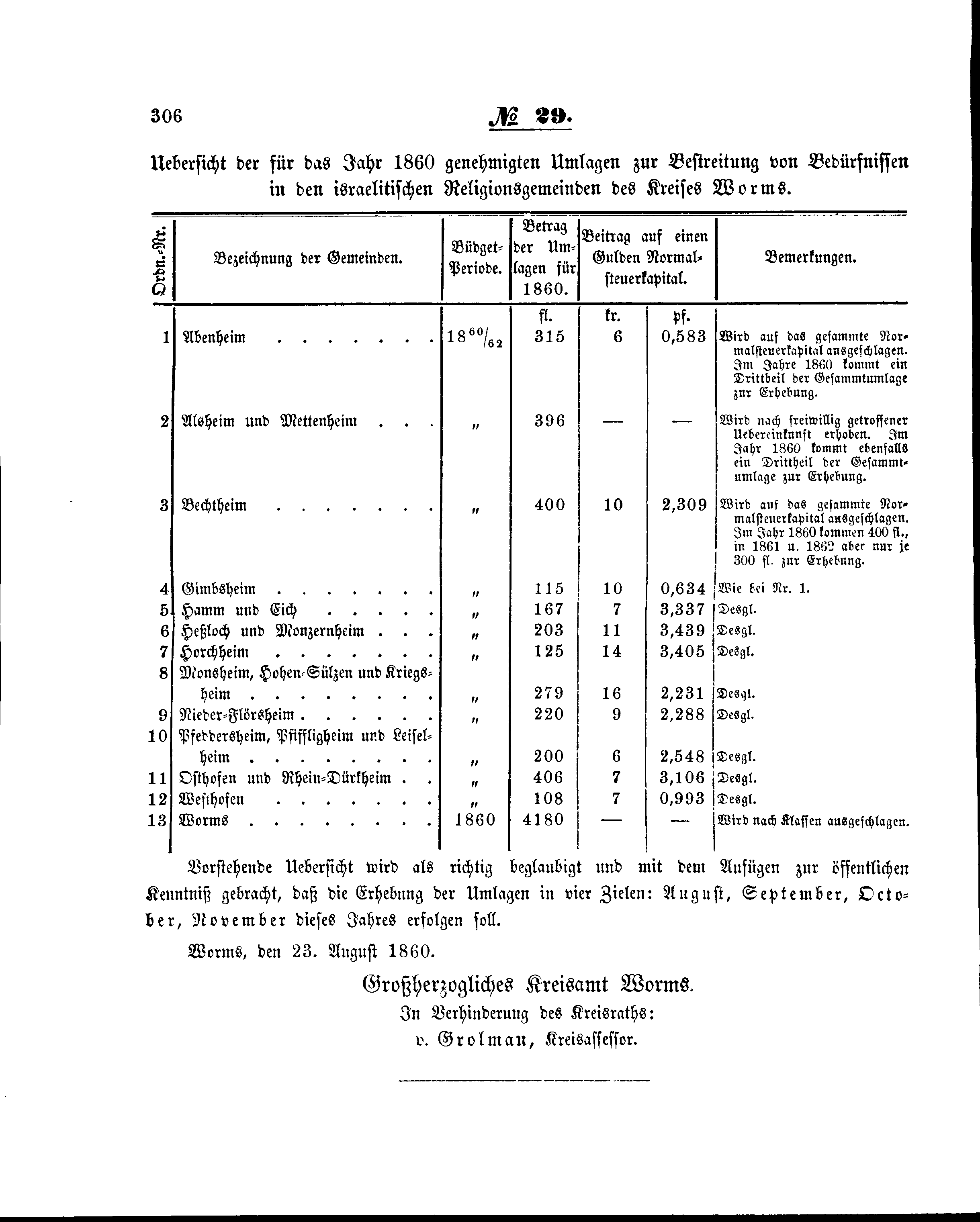 Uebersicht der für das Jahr 1860 genehmigten Umlagen zur Bestreitung von Bedürfnissen in den israelitischen Religionsgemeinden des Kreises Worms.