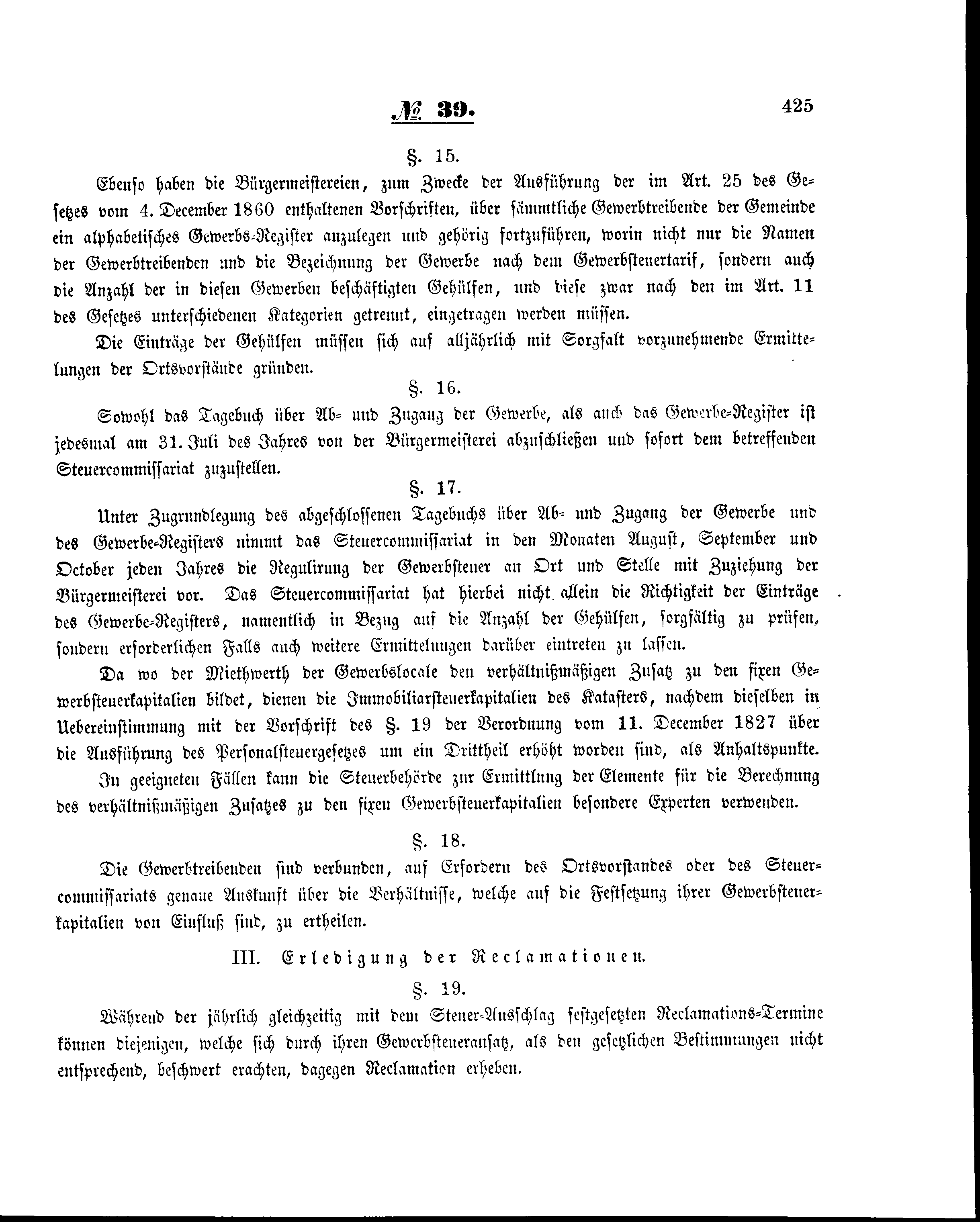 Sowohl das Tagebuch über Ab- und Zugang der Gewerbe, als auch das Gewerbe-Register ist jedesmal am 31.Iuli des Jahres von der Bürgermeisterei abzuschließen und sofort dem betreffenden Steuercommissariat zuzustellen.
