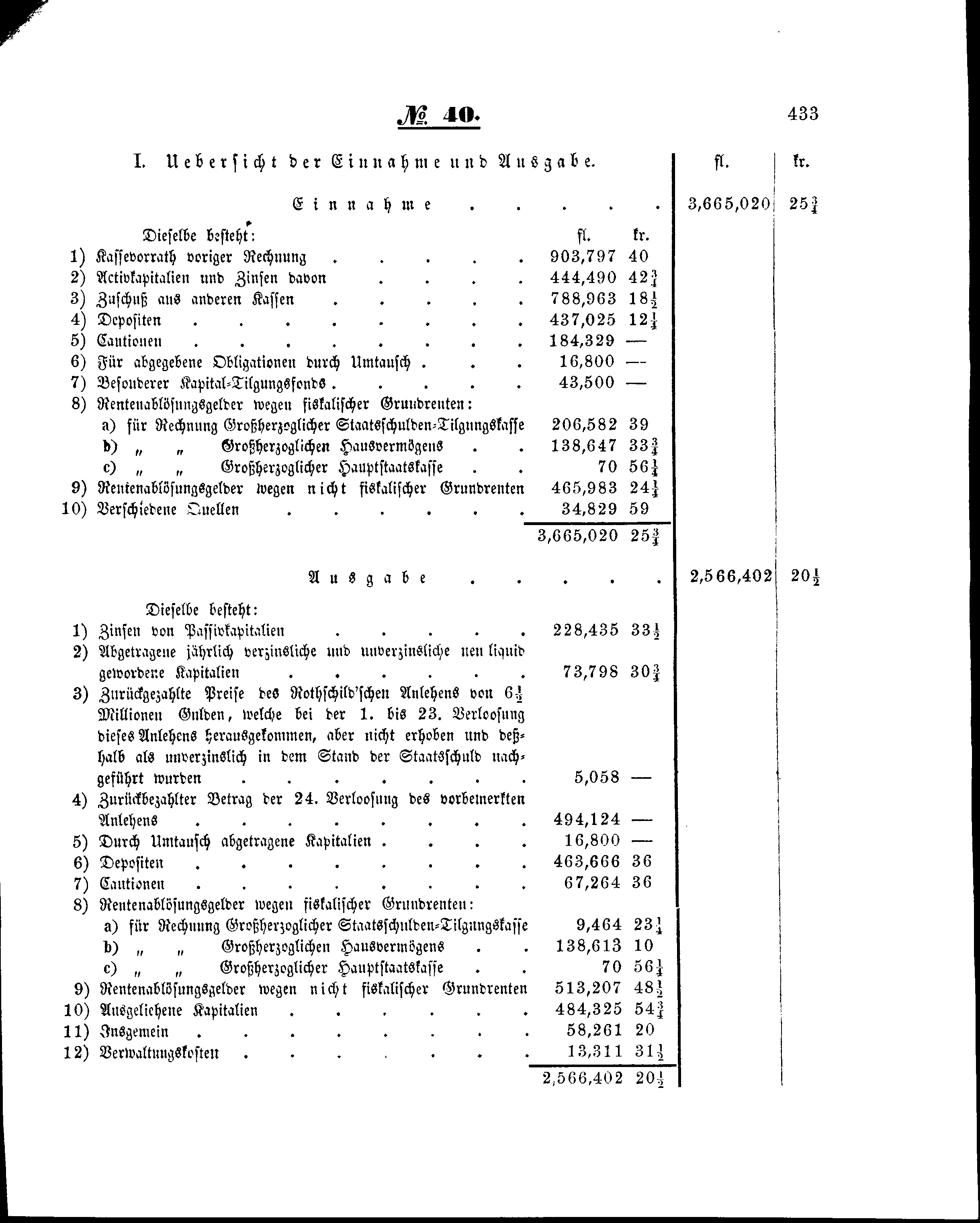 | 3) | Zurückgezahlte Preise des Rothschild`schen Anlehens von 61/2 Millionen Gulden, welche bei der 1. bis 23. Verloosung dieses Anlehens herausgekommen, aber nicht erhoben und deßhalb als unverzinslich in dem Stand der Staatsschuld nachgeführt wurden | 5,058 | - | ||