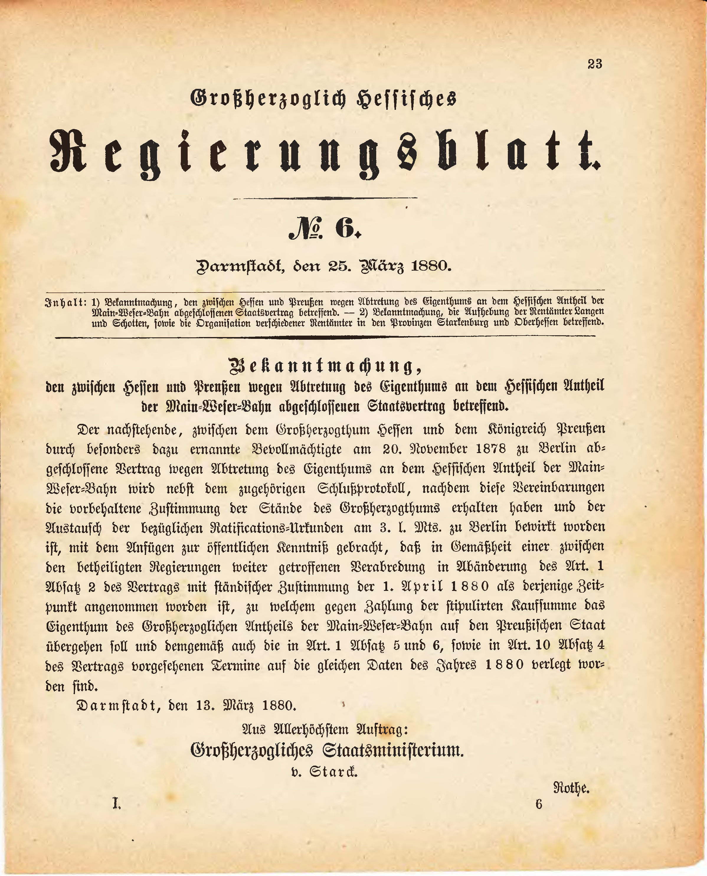 Der nachstehende, zwischen dem Großherzogthum Hessen und dem Königreich Preußen durch besonders dazu ernannte Bevollmächtigte am 20. November 1878 zu Berlin abgeschlossene Vertrag wegen Abtretung des Eigenthums an dem Hessischen Antheil der Main-Weser-Bahn wird nebst dem zugehörigen Schlußprotokoll, nachdem diese Vereinbarungen die vorbehaltene Zustimmung der Stände des Großherzogthums erhalten haben und der Austausch der bezüglichen Ratifications-Urkunden am 3. l. Mts. zu Berlin bewirkt worden ist, mit dem Anfügen zur öffentlichen Kenntniß gebracht, daß in Gemäßheit einer zwischen den betheiligten Regierungen weiter getroffenen Verabredung in Abänderung des Art. 1 Absatz 2 des Vertrags mit ständischer Zustimmung der 1. April 1880 als derjenige Zeitpunkt angenommen worden ist, zu welchem gegen Zahlung der stipulirten Kaufsumme das Eigenthum des Großherzoglichen Antheils der Main-Weser-Bahn aus den Preußischen Staat übergehen soll und demgemäß auch die in Art. 1 Absatz 5 und 6, sowie in Art. 10 Absatz 4 des Vertrags vorgesehenen Termine auf die gleichen Daten des Jahres 1880 verlegt worden sind.