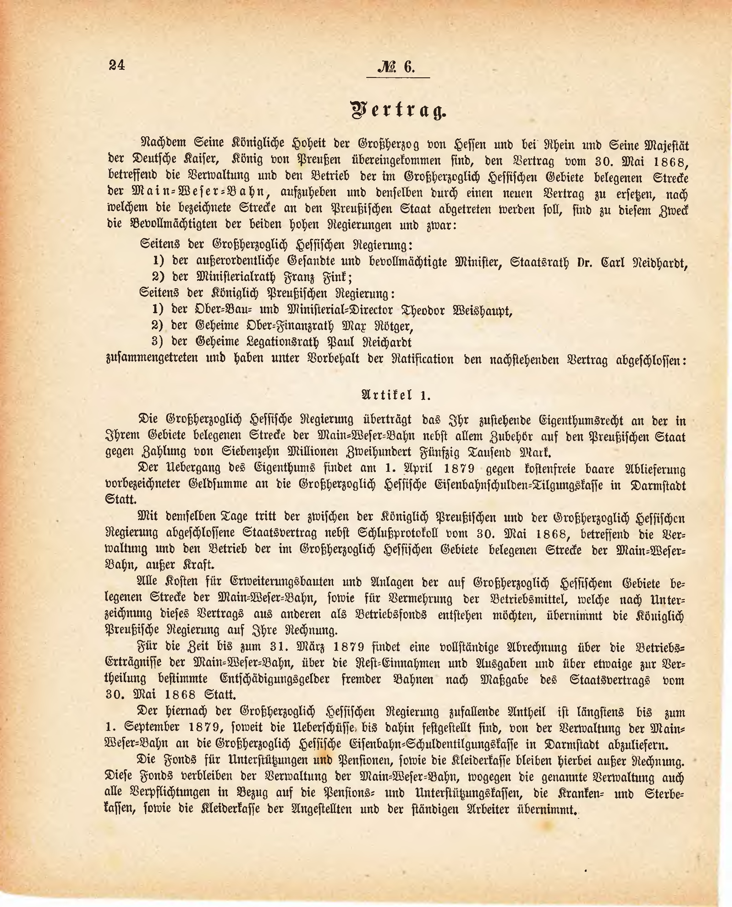 Nachdem Seine Königliche Hoheit der Großherzog von Hessen und bei Rhein und Seine Majestät der Deutsche Kaiser, König von Preußen übereingekommen sind, den Vertrag vom 30. Mai 1868, betreffend die Verwaltung und den Betrieb der im Großherzoglich Hessischen Gebiete belegenen Strecke der Main-Weser-Bahn, aufzuheben und denselben durch einen neuen Vertrag zu ersetzen, nach welchem die bezeichnete Strecke an den Preußischen Staat abgetreten werden soll, sind zu diesem Zweck die Bevollmächtigten der beiden hohen Regierungen und zwar: