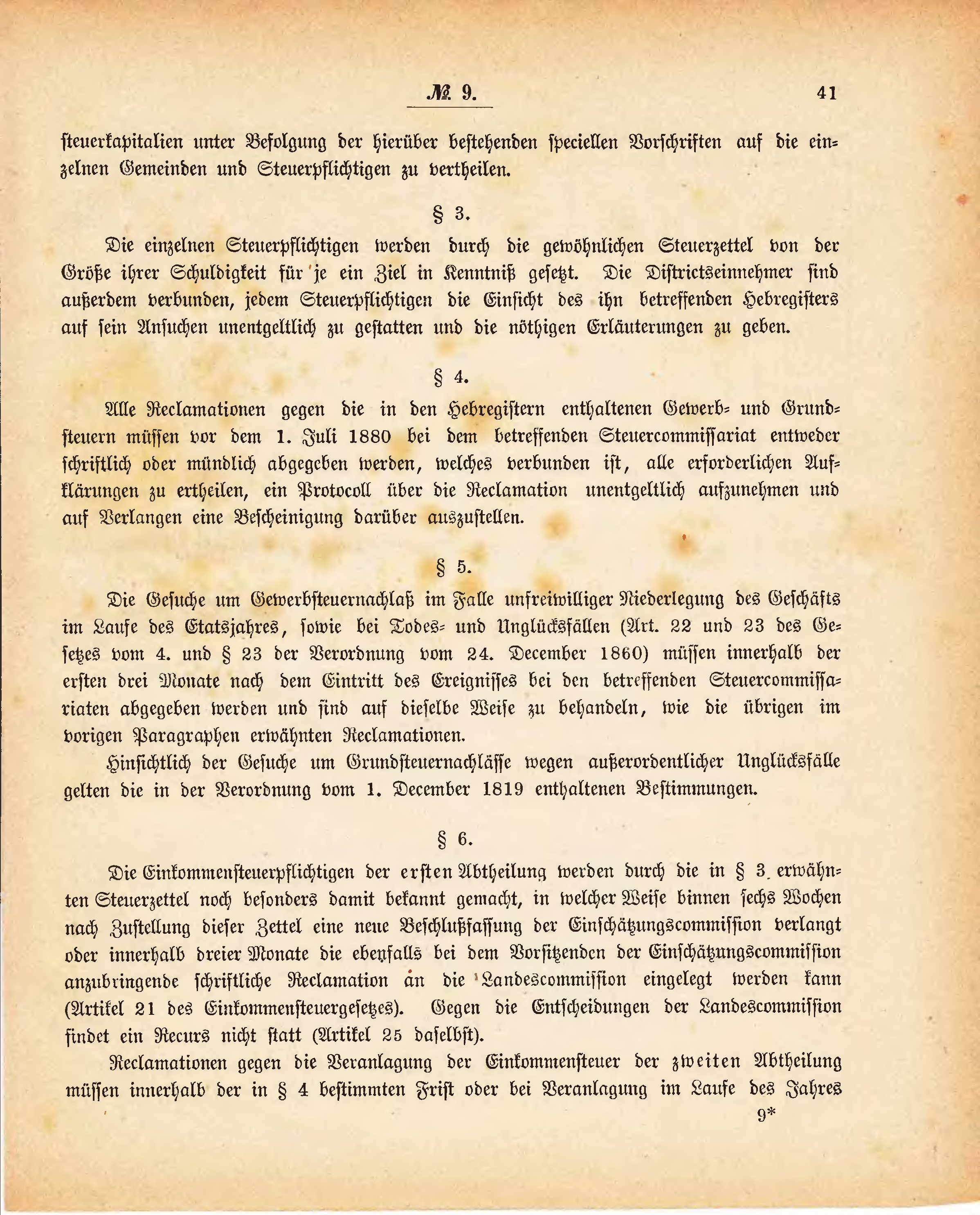Alle Reclamationen gegen die in den Hebregistern enthaltenen Gewerb- und Grundsteuern müssen vor dem 1. Juli 1880 bei dem betreffenden Steuercommissariat entweder schriftlich oder mündlich abgegeben werden, welches verbunden ist, alle erforderlichen Aufklärungen zu ertheilen, ein Protocoll über die Reclamation unentgeltlich aufzunehmen und auf Verlangen eine Bescheinigung darüber auszustellen.