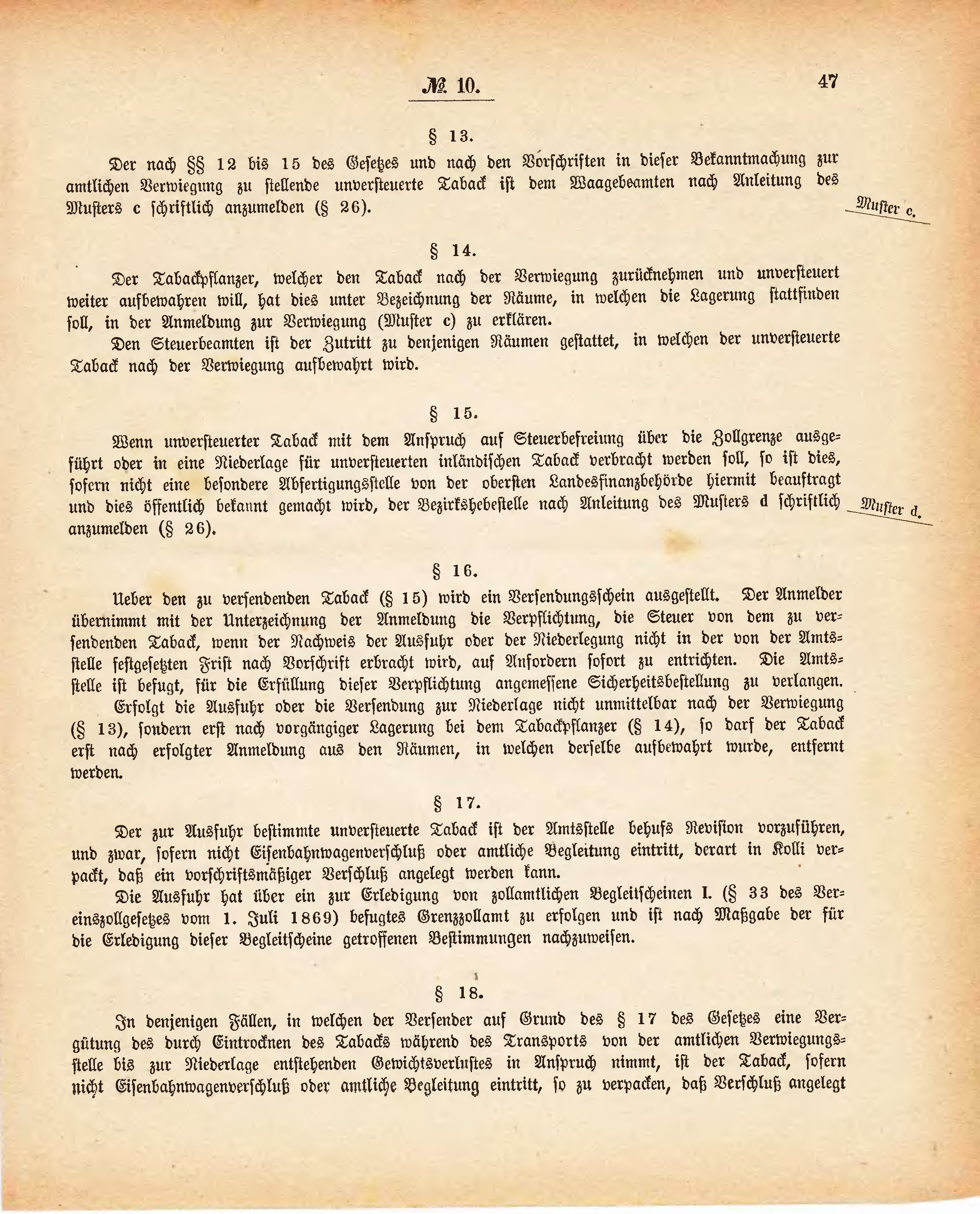 | Der Tabackpflanzer, welcher den Taback nach der Verwiegung zurücknehmen und unversteuert weiter aufbewahren will, hat dies unter Bezeichnung der Räume, in welchen die Lagerung stattfinden soll, in der Anmeldung zur Verwiegung (Muster c) zu erklären. Den Steuerbeamten ist der Zutritt zu denjenigen Räumen gestattet, in welchen der unversteuerte Taback nach der Verwiegung aufbewahrt wird. |