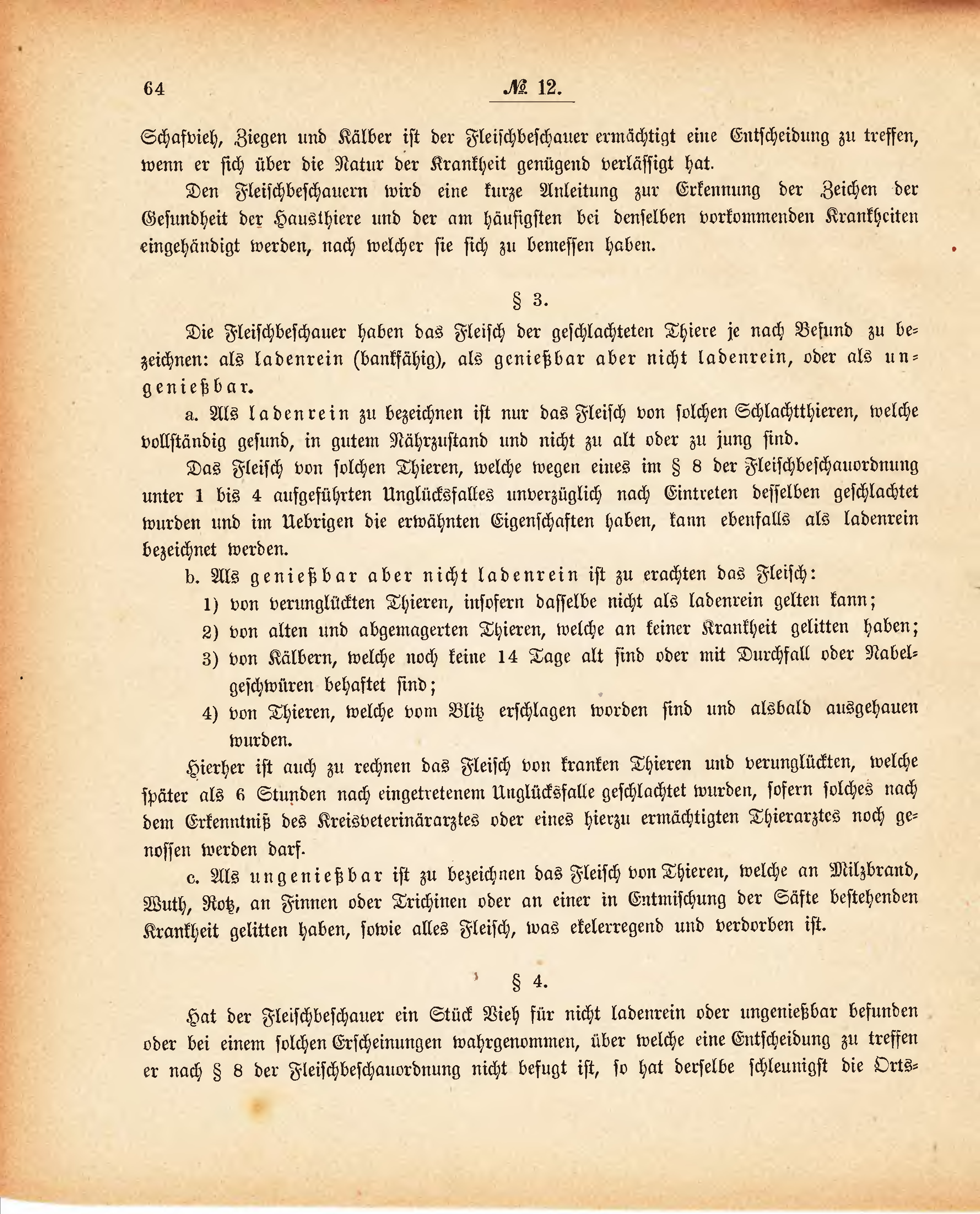 Die Fleischbeschauer haben das Fleisch der geschlachteten Thiere je nach Befund zu bezeichnen: als ladenrein (bankfähig), als genießbar aber nicht ladenrein, oder als ungenießbar.