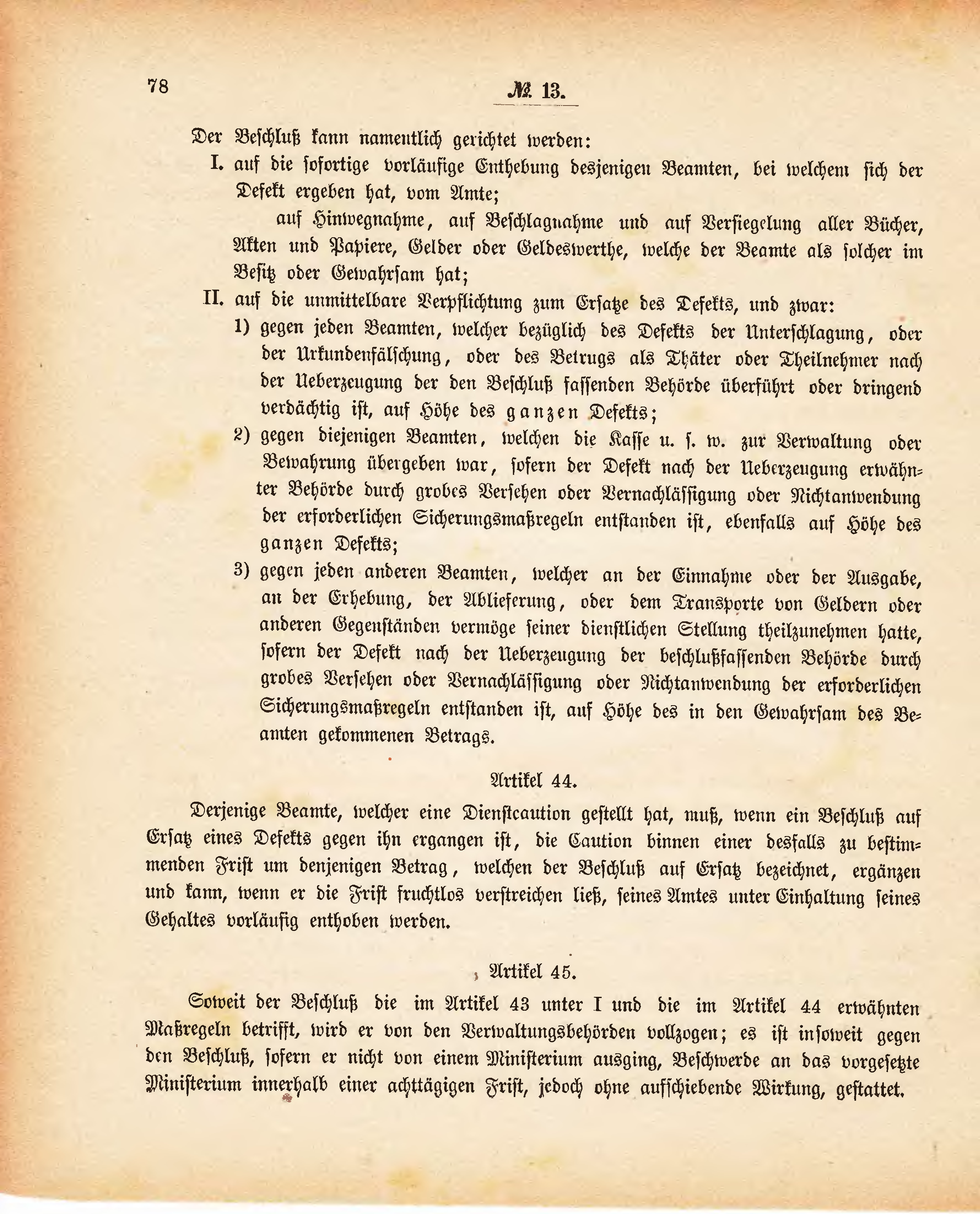 Derjenige Beamte, welcher eine Dienstcaution gestellt hat, muß, wenn ein Beschluß auf Ersatz eines Defekts gegen ihn ergangen ist, die Caution binnen einer desfalls zu bestimmenden Frist um denjenigen Betrag, welchen der Beschluß auf Ersatz bezeichnet, ergänzen und kann, wenn er die Frist fruchtlos verstreichen ließ, seines Amtes unter Einhaltung seines Gehaltes vorläufig enthoben werden.