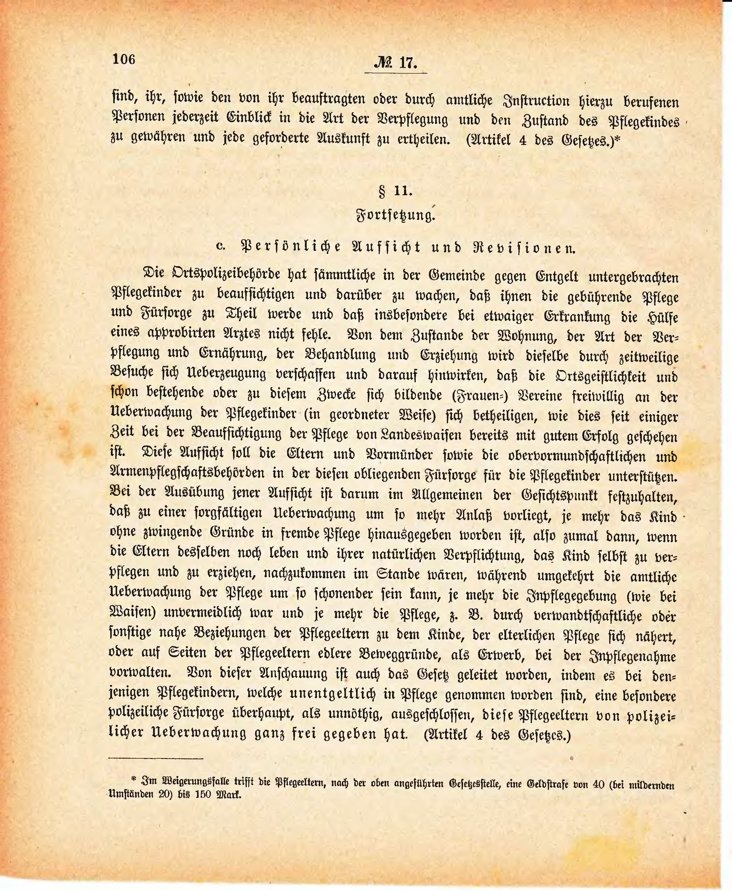 * Im Weigerungsfalle trifft die Pflegeeltern, nach der oben angeführten Gesetzesstelle, eine Geldstrafe von 40 (bei mildernden Umständen 20) bis 150 Mark.