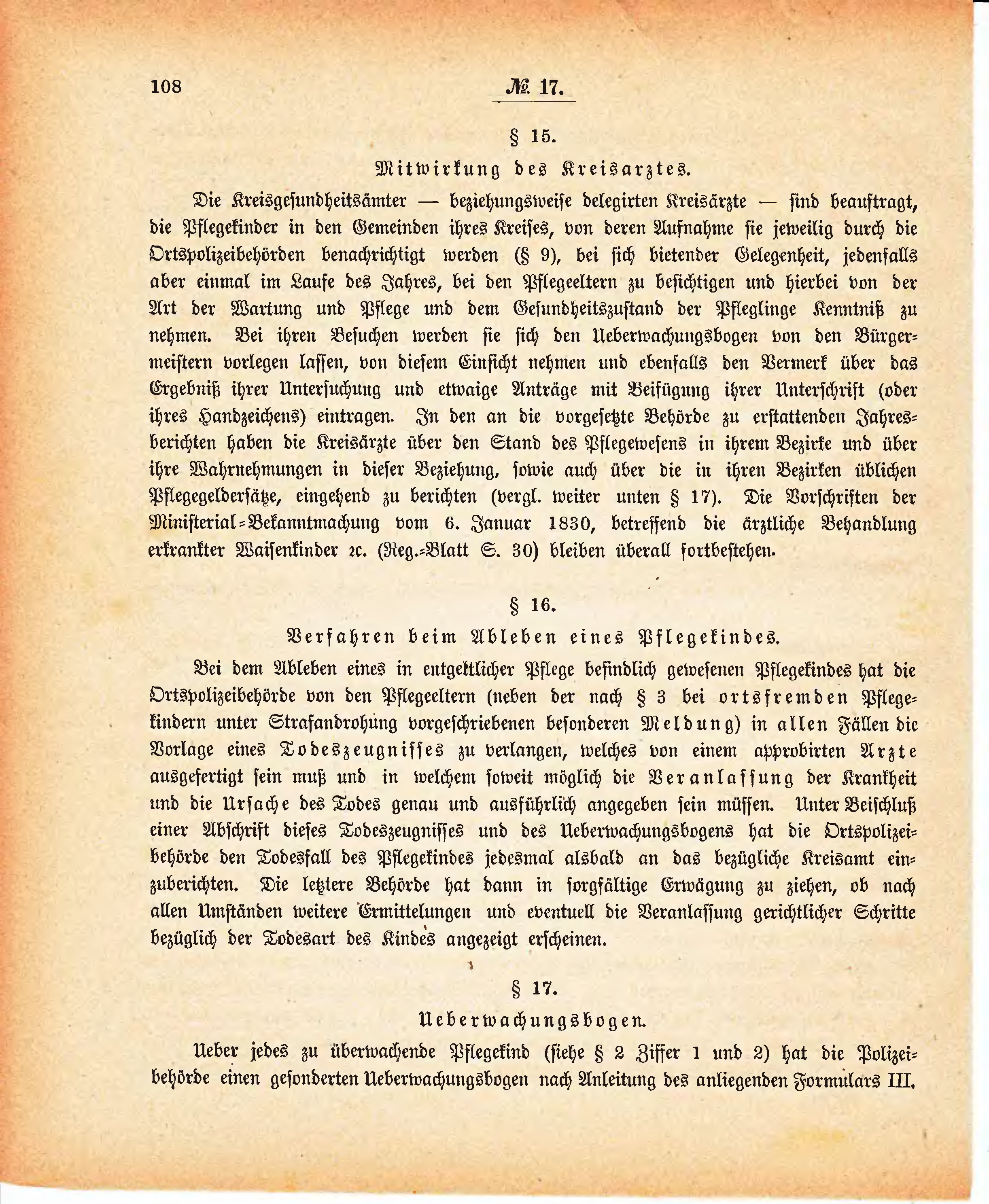 Die Kreisgesundheitsämter - beziehungsweise delegirten Kreisärzte - sind beauftragt, die Pflegekinder in den Gemeinden ihres Kreises, von deren Aufnahme sie jeweilig durch die Ortspolizeibehörden benachrichtigt werden (§ 9), bei sich bietender Gelegenheit, jedenfalls aber einmal im Laufe des Jahres, bei den Pflegeeltern zu besichtigen und hierbei von der Art der Wartung und Pflege und dem Gesundheitszustand der Pfleglinge Kenntniß zu nehmen. Bei ihren Besuchen werden sie sich den Ueberwachungsbogen von den Bürgermeistern vorlegen lassen, von diesem Einsicht nehmen und ebenfalls den Vermerk über das Ergebniß ihrer Untersuchung und etwaige Anträge mit Beifügung ihrer Unterschrift (oder ihres Handzeichens) eintragen. In den an die vorgesetzte Behörde zu erstattenden Jahresberichten haben die Kreisärzte über den Stand des Pflegewesens in ihrem Bezirke und über ihre Wahrnehmungen in dieser Beziehung, sowie auch über die in ihren Bezirken üblichen Pflegegeldersätze, eingehend zu berichten (vergl. weiter unten § 17). Die Vorschriften der Ministerial-Bekanntmachung vom 6. Januar 1830, betreffend die ärztliche Behandlung erkrankter Waisenkinder etc. (Reg.-Blatt S. 30) bleiben überall fortbestehen.