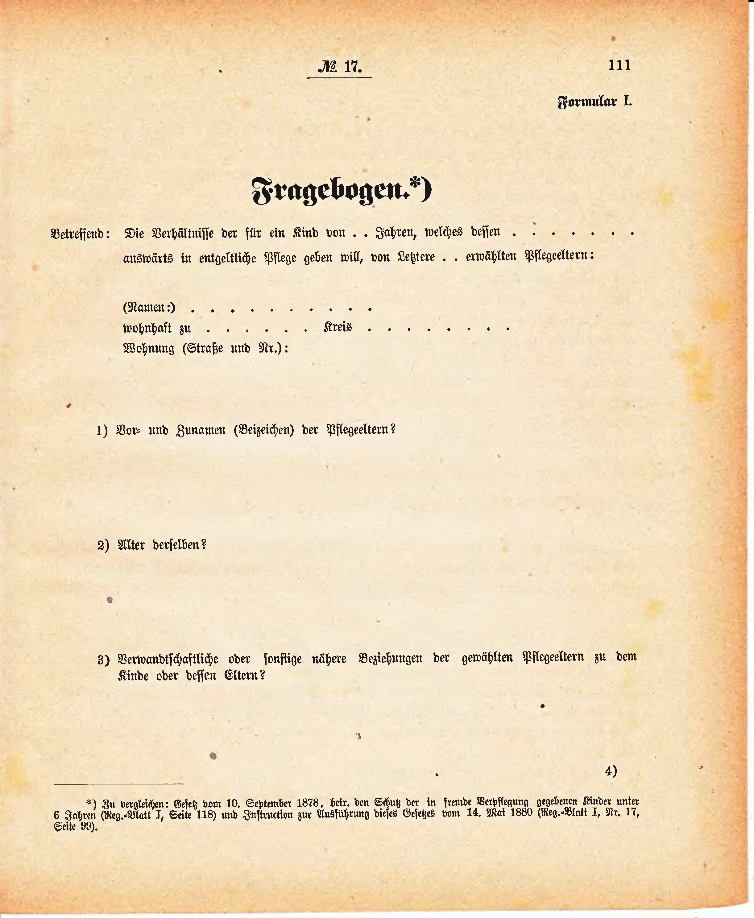 *) Zu vergleichen: Gesetz vom 10. September 1878, betr. den Schutz der in fremde Verpflegung gegebenen Kinder unter 6 Jahren (Reg.-Blatt I, Seite 118) und Instruction zur Ausführung dieses Gesetzes vom 14. Mai 1880 (Reg.-Blatt I, Nr. 17, Seite 99).