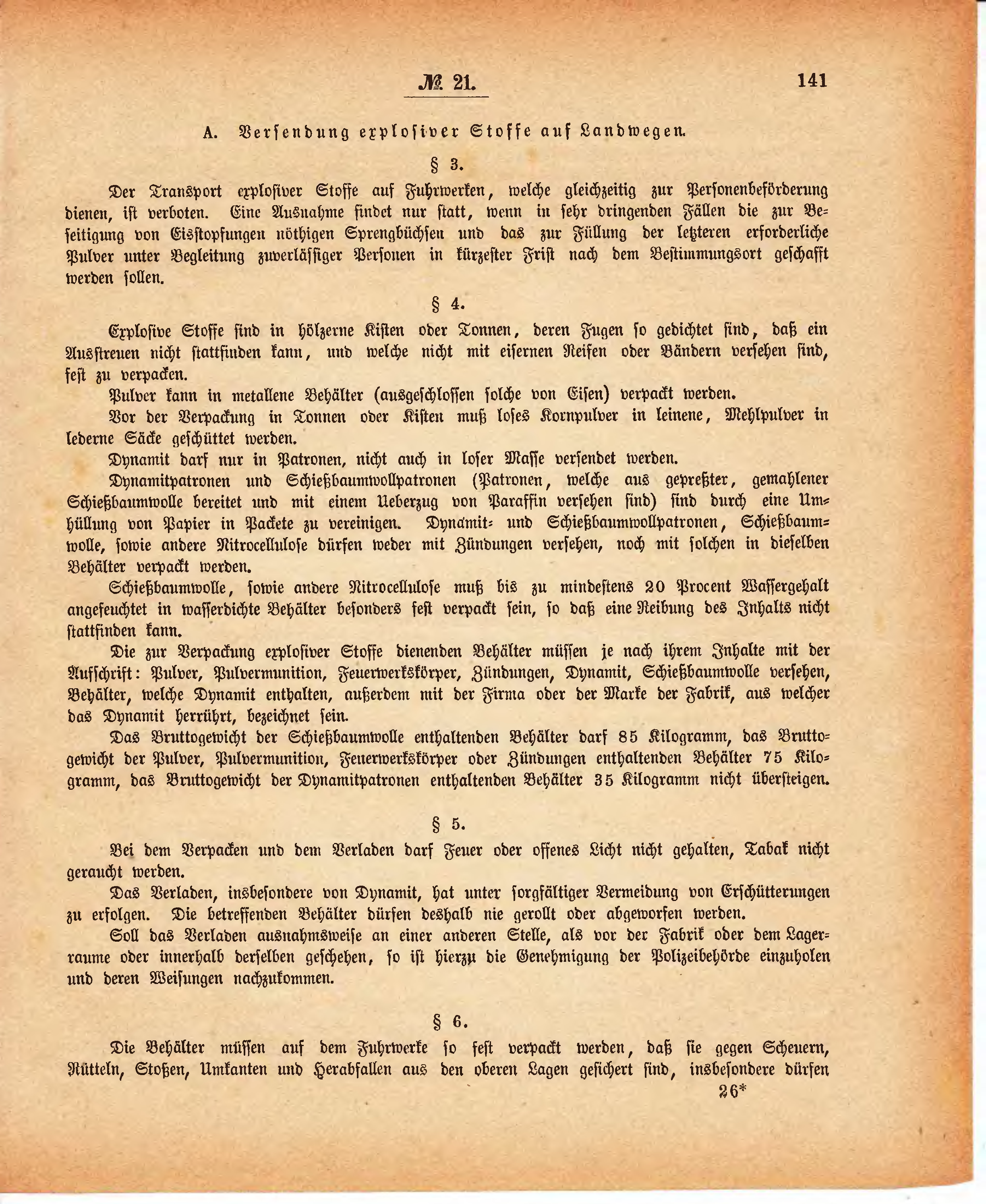 Dynamitpatronen und Schießbaumwollpatronen (Patronen, welche aus gepreßter, gemahlener Schießbaumwolle bereitet und mit einem Ueberzug von Paraffin versehen sind) sind durch eine Umhüllung von Papier in Packete zu vereinigen. Dynamit- und Schießbaumwollpatronen, Schießbaumwolle, sowie andere Nitrocellulose dürfen weder mit Zündungen versehen, noch mit solchen in dieselben Behälter verpackt werden.