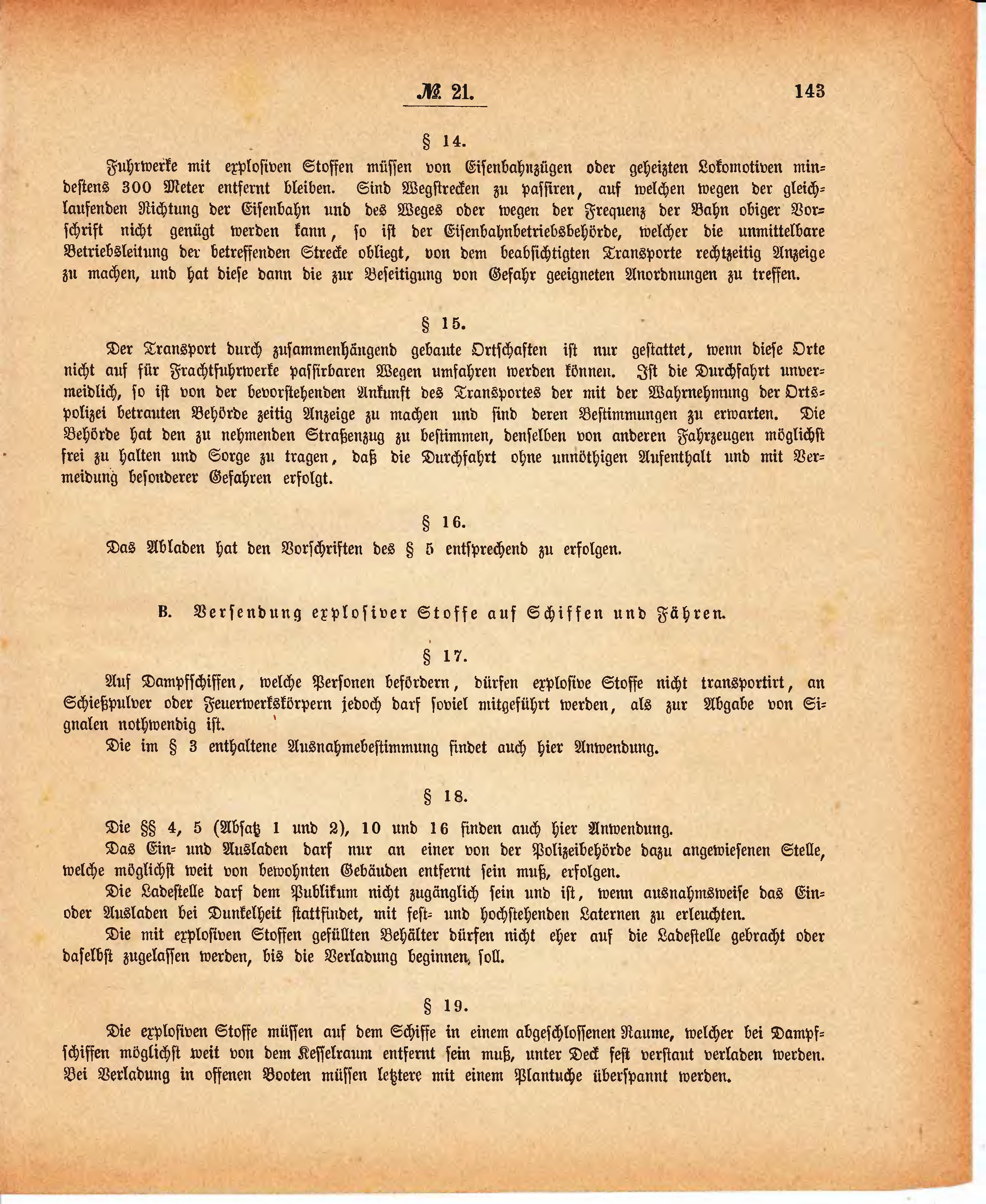 Die explosiven Stoffe müssen aus dem Schiffe in einem abgeschlossenen Raume, welcher bei Dampfschiffen möglichst weit von dem Kesselraum entfernt sein muß, unter Deck fest verstaut verladen werden. Bei Verladung in offenen Booten müssen letztere mit einem Plantuche überspannt werden.