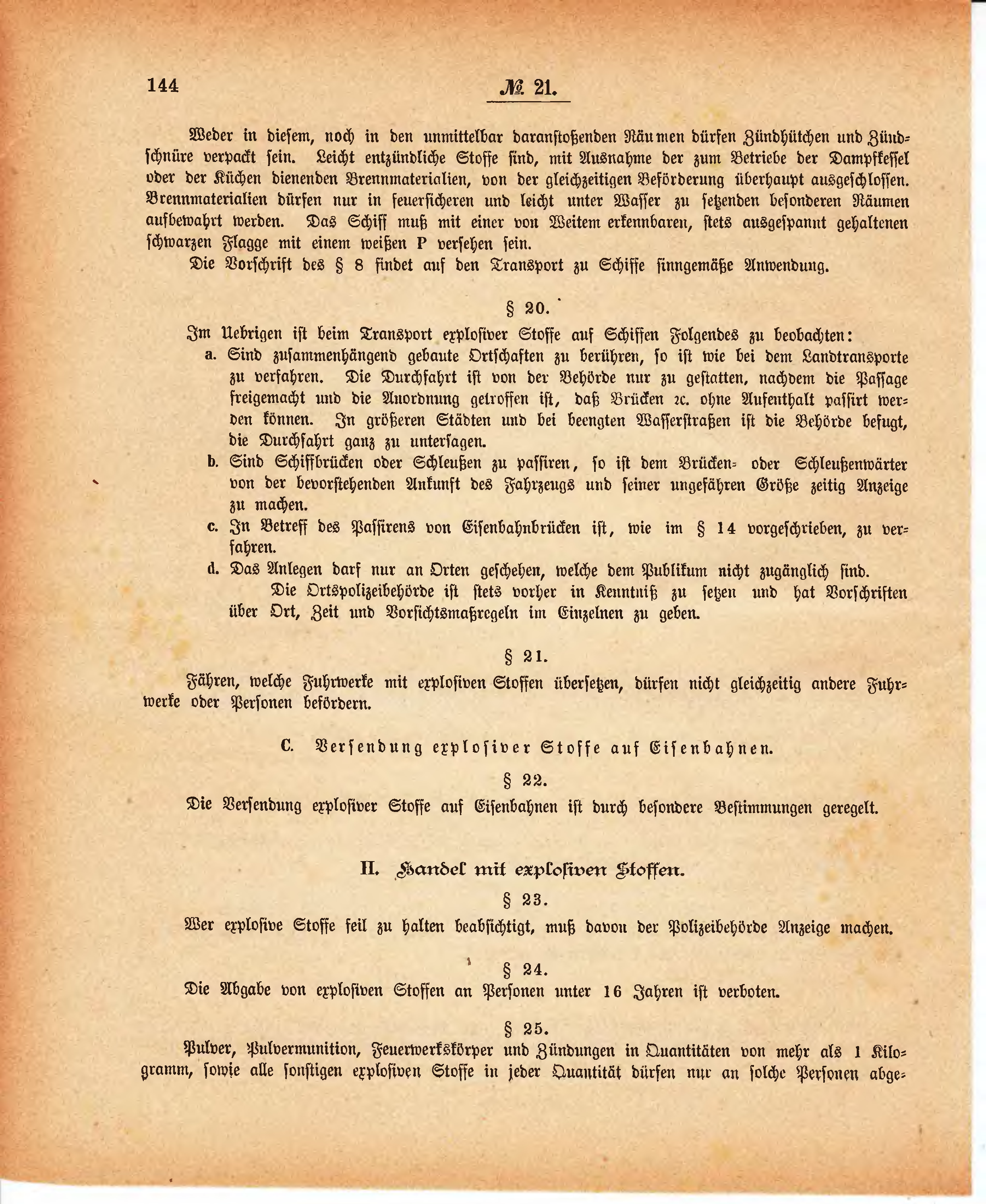 Weder in diesem, noch in den unmittelbar daranstoßenden Räumen dürfen Zündhütchen und Zündschnüre verpackt sein. Leicht entzündliche Stoffe sind, mit Ausnahme der zum Betriebe der Dampfkessel oder der Küchen dienenden Brennmaterialien, von der gleichzeitigen Beförderung überhaupt ausgeschlossen. Brennmaterialien dürfen nur in feuersicheren und leicht unter Wasser zu setzenden besonderen Räumen aufbewahrt werden. Das Schiff muß mit einer von Weitem erkennbaren, stets ausgespannt gehaltenen schwarzen Flagge mit einem weißen P versehen sein.