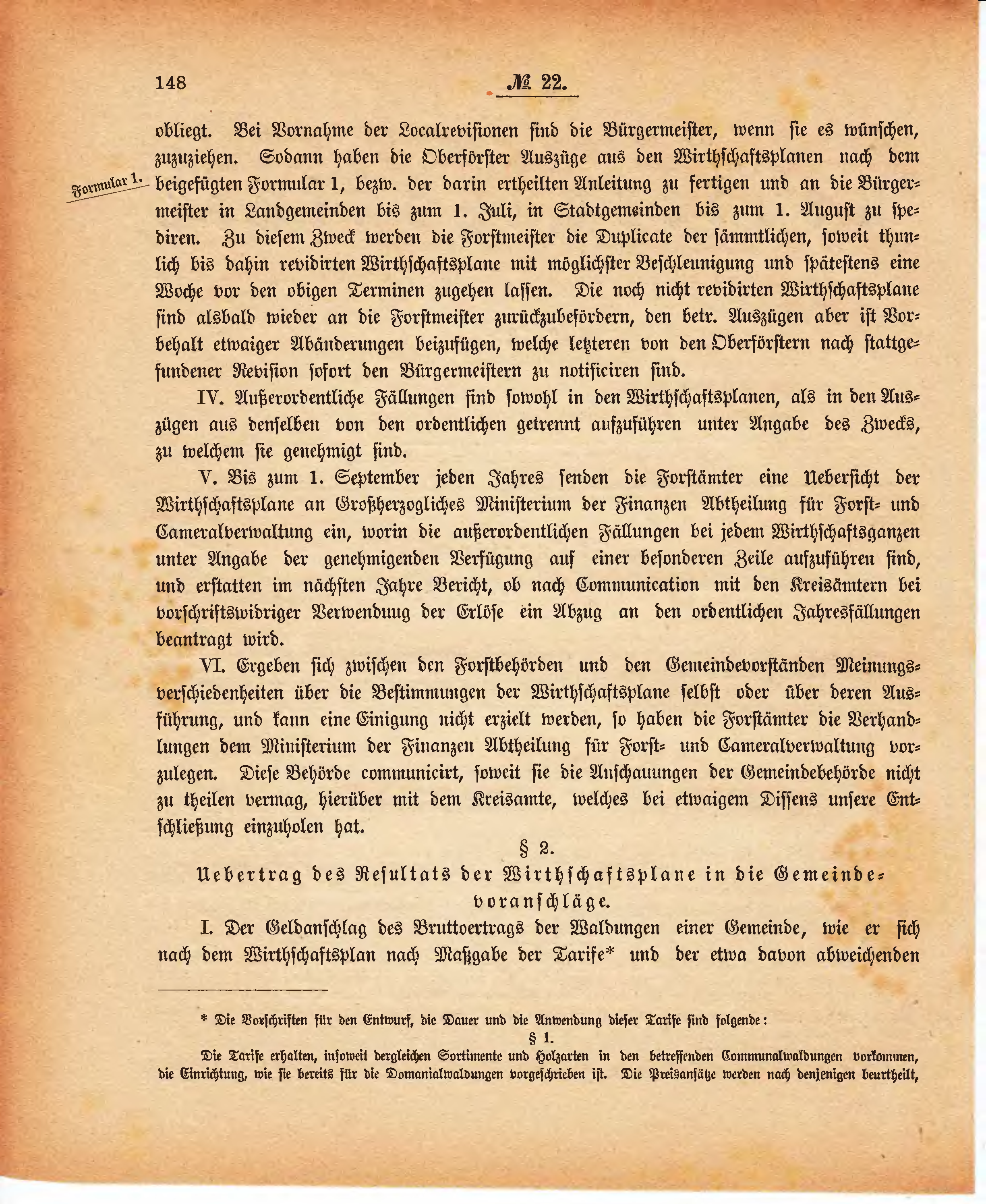 obliegt. Bei Vornahme der Localrevisionen sind die Bürgermeister, wenn sie es wünschen, zuzuziehen. Sodann haben die Oberförster Auszüge aus den Wirthschaftsplanen nach dem beigefügten Formular 1, bezw. der darin ertheilten Anleitung zu fertigen und an die Bürgermeister in Landgemeinden bis zum 1. Juli, in Stadtgemeinden bis zum 1. August zu spediren. Zu diesem Zweck werden die Forstmeister die Duplicate der sämmtlichen, soweit thunlich bis dahin revidirten Wirthschaftsplane mit möglichster Beschleunigung und spätestens eine Woche vor den obigen Terminen zugehen lassen. Die noch nicht revidirten Wirthschaftsplane sind alsbald wieder an die Forstmeister zurückzubefördern, den betr. Auszügen aber ist Vorbehalt etwaiger Abänderungen beizufügen, welche letzteren von den Oberförstern nach stattgefundener Revision sofort den Bürgermeistern zu notificiren sind. |
