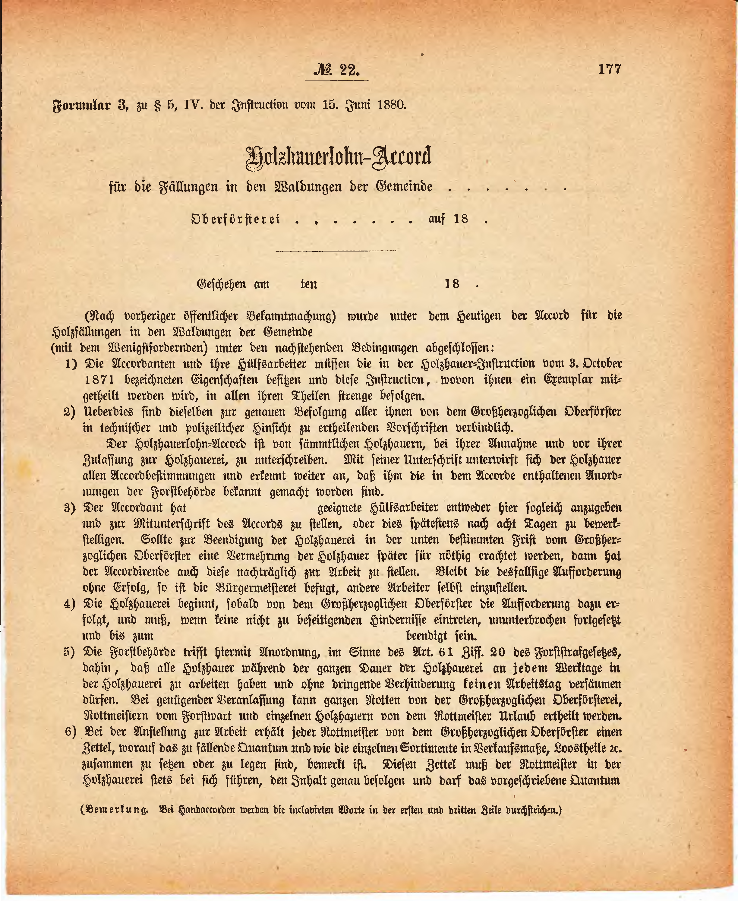 | 4) | Die Holzhauerei beginnt, sobald von dem Großherzoglichen Oberförster die Aufforderung dazu erfolgt, und muß, wenn keine nicht zu beseitigenden Hindernisse eintreten, ununterbrochen fortgesetzt und bis zum .......... beendigt sein. | |