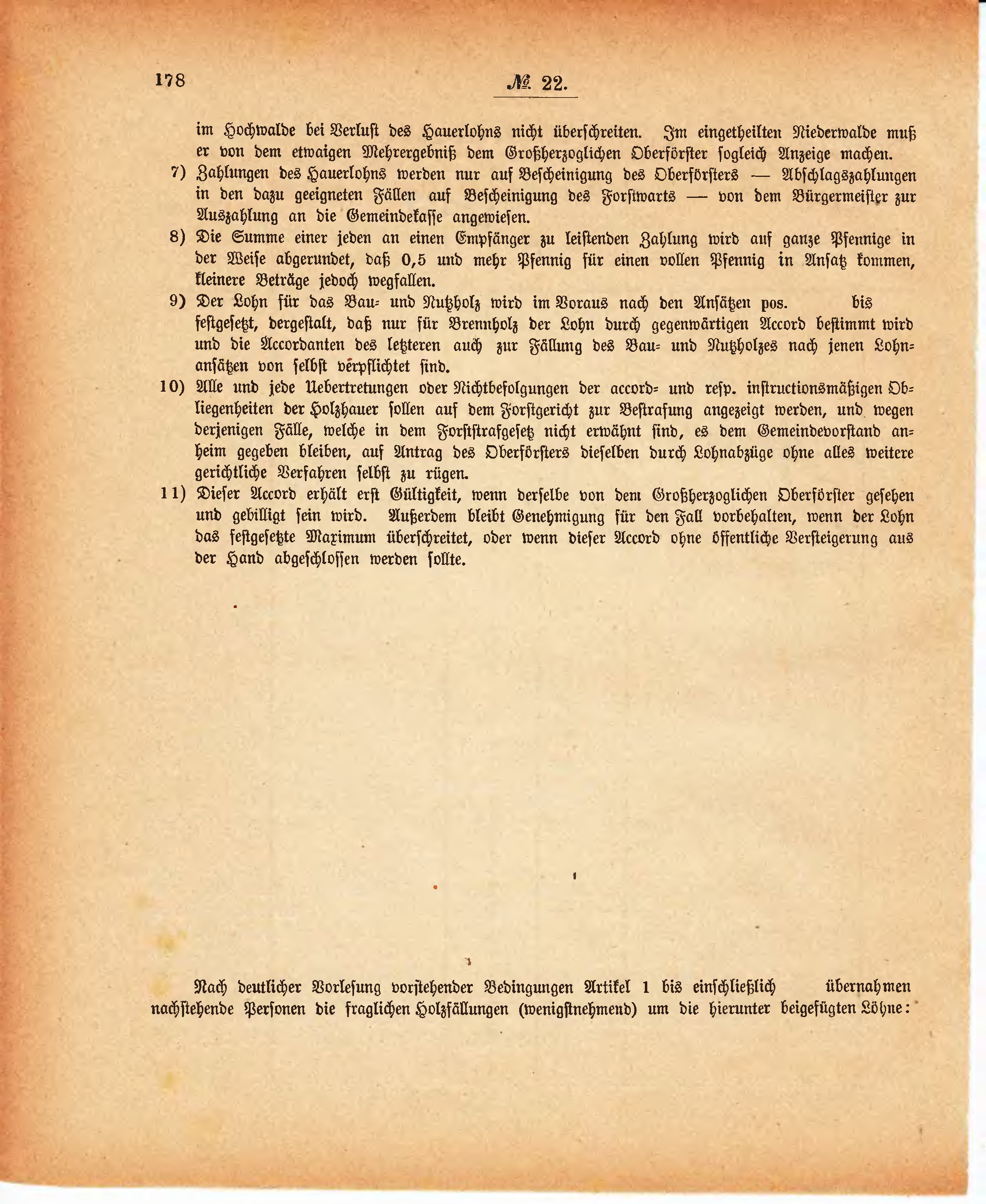 | 11) | Dieser Accord erhält erst Gültigkeit, wenn derselbe von dem Großherzoglichen Oberförster gesehen und gebilligt sein wird. Außerdem bleibt Genehmigung für den Fall vorbehalten, wenn der Lohn das festgesetzte Maximum überschreitet, oder wenn dieser Accord ohne öffentliche Versteigerung aus der Hand abgeschlossen werden sollte. |