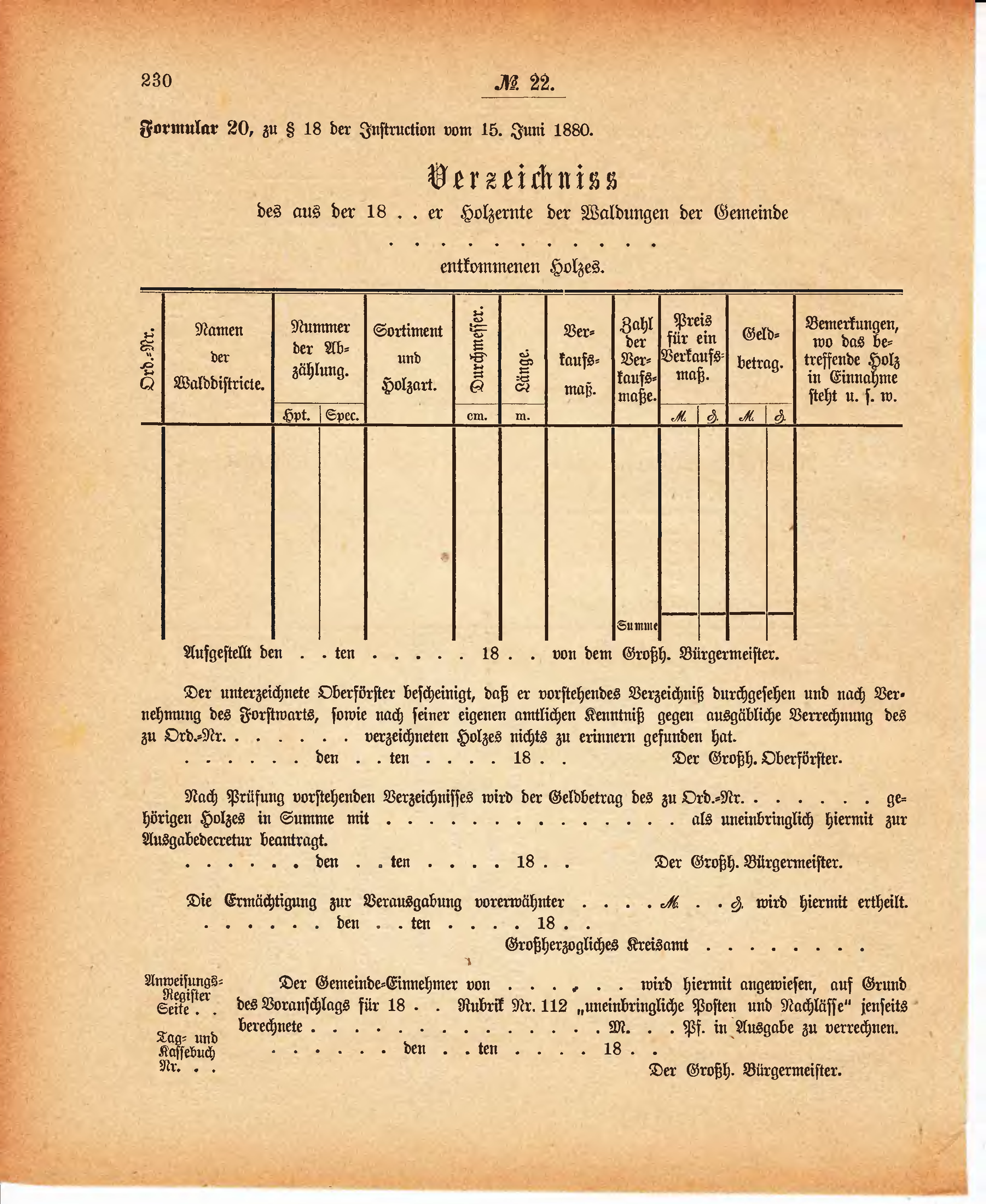 Der unterzeichnete Oberförster bescheinigt, daß er vorstehendes Verzeichniß durchgesehen und nach Vernehmung des Forstwarts, sowie nach seiner eigenen amtlichen Kenntniß gegen ausgäbliche Verrechnung des zu Ord.-Nr. . . . . . . verzeichneten Holzes nichts zu erinnern gefunden hat.