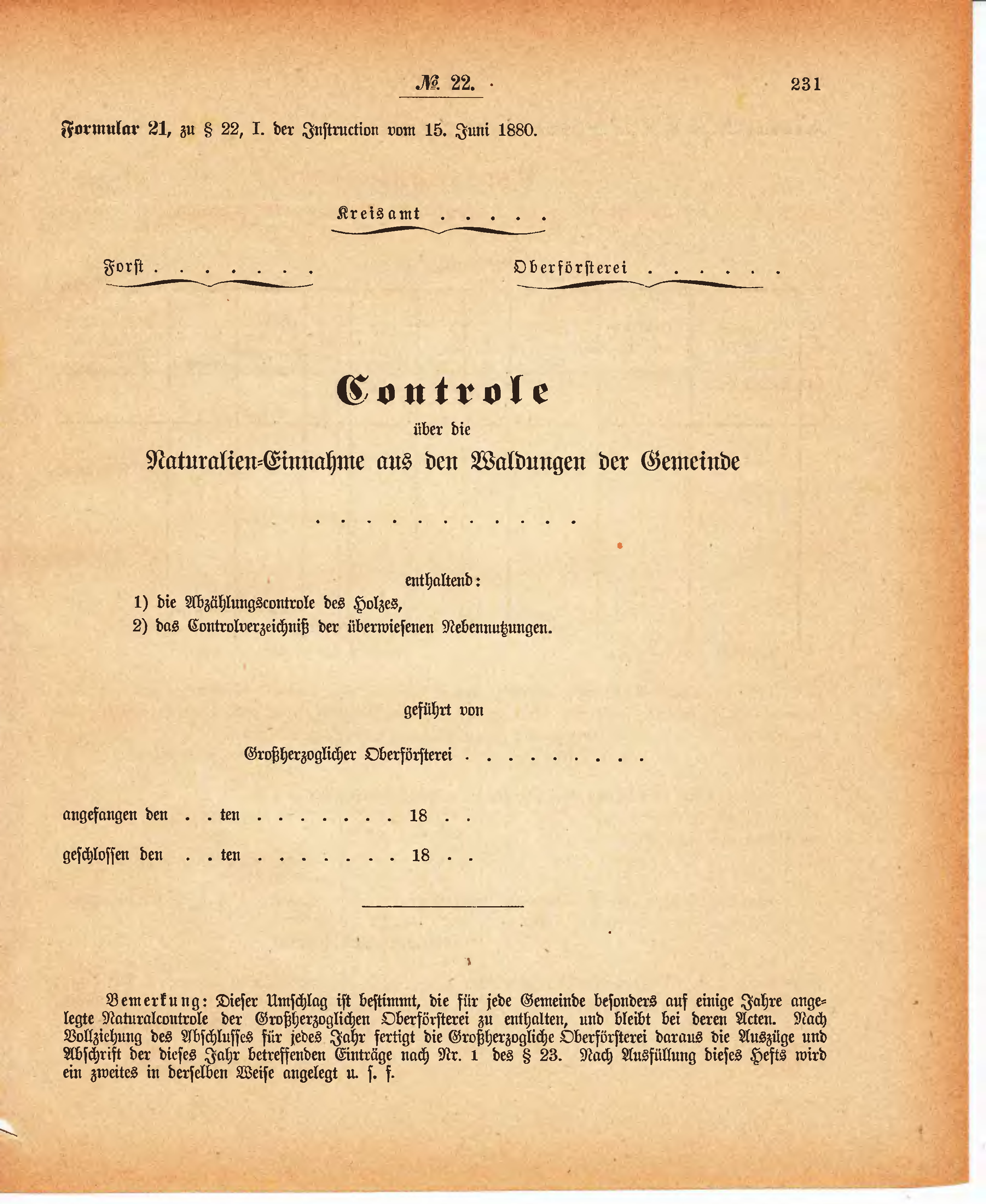 Bemerkung: Dieser Umschlag ist bestimmt, die für jede Gemeinde besonders auf einige Jahre angelegte Naturalcontrole der Großherzoglichen Oberförsterei zu enthalten, und bleibt bei deren Acten. Nach Vollziehung des Abschlusses für jedes Jahr fertigt die Großherzogliche Oberförsterei daraus die Auszüge und Abschrift der dieses Jahr betreffenden Einträge nach Nr. 1 des § 23. Nach Ausfüllung dieses Hefts wird ein zweites in derselben Weise angelegt u. s. f.