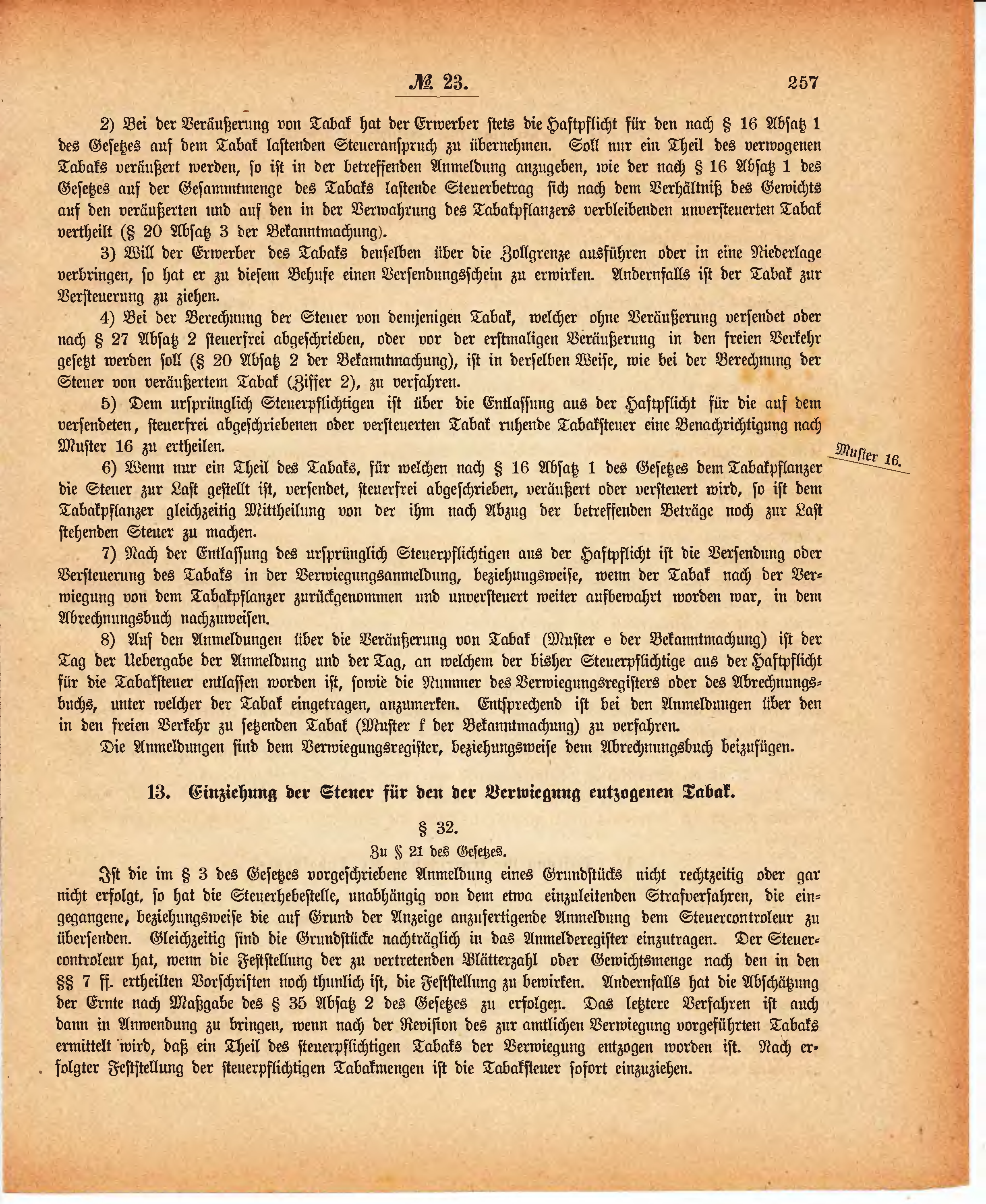| 5) Dem ursprünglich Steuerpflichtigen ist über die Entlassung aus der Haftpflicht für die auf dem versendeten, steuerfrei abgeschriebenen oder versteuerten Tabak ruhende Tabaksteuer eine Benachrichtigung nach Muster 16 zu ertheilen. | Muster 16. |