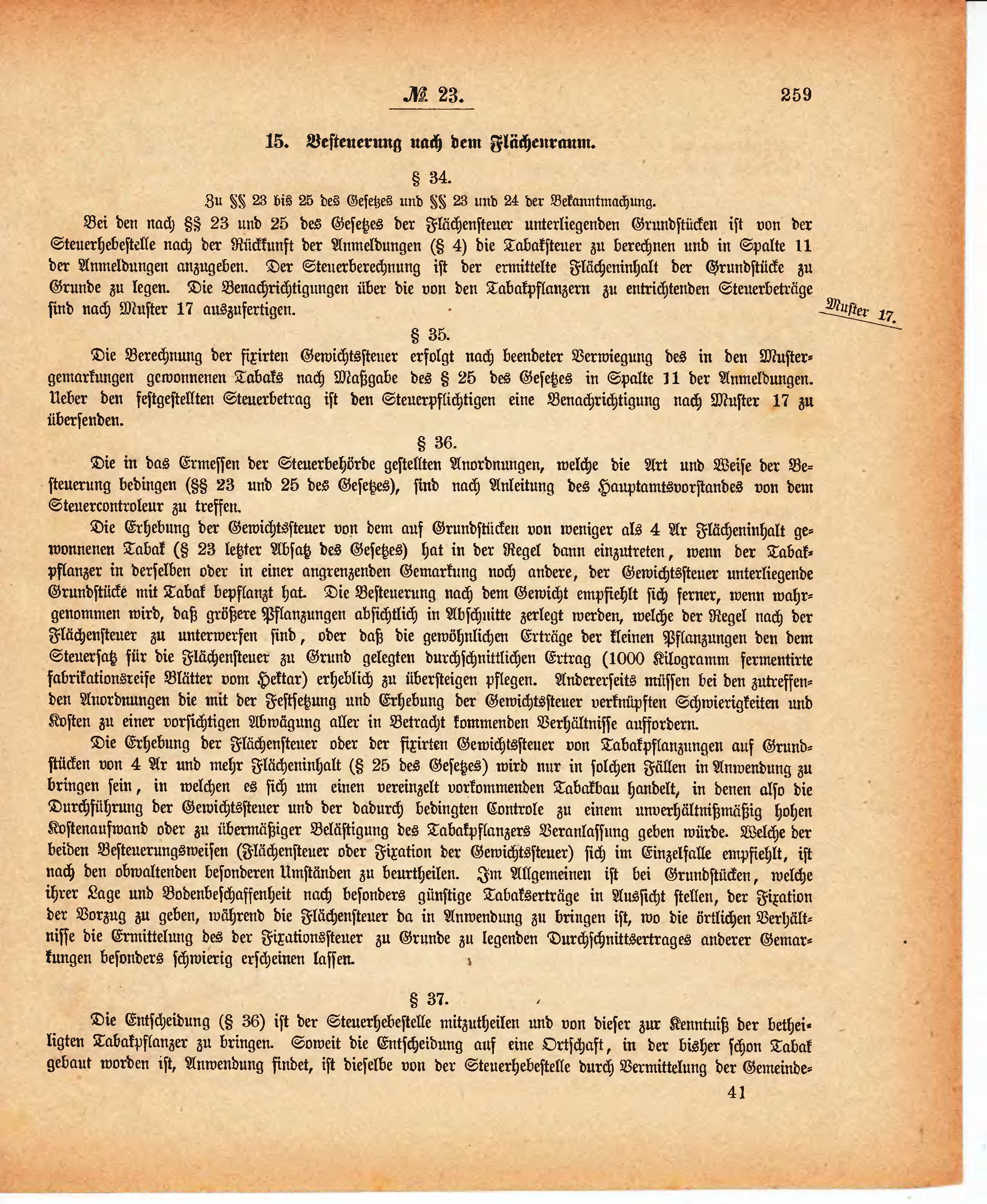 Die Berechnung der fixirten Gewichtssteuer erfolgt nach beendeter Verwiegung des in den Mustergemarkungen gewonnenen Tabaks nach Maßgabe des § 25 des Gesetzes in Spalte 11 der Anmeldungen. Ueber den festgestellten Steuerbetrag ist den Steuerpflichtigen eine Benachrichtigung nach Muster 17 zu übersenden.