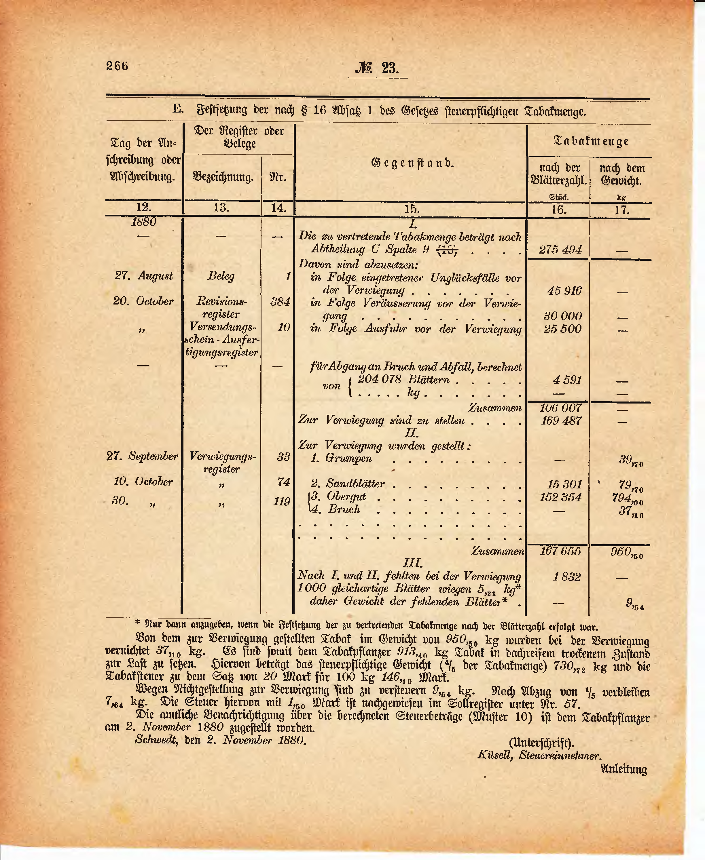 Die amtliche Benachrichtigung über die berechneten Steuerbeträge (Muster 10) ist dem Tabakpflanzer am 2. November 1880 zugestellt worden.