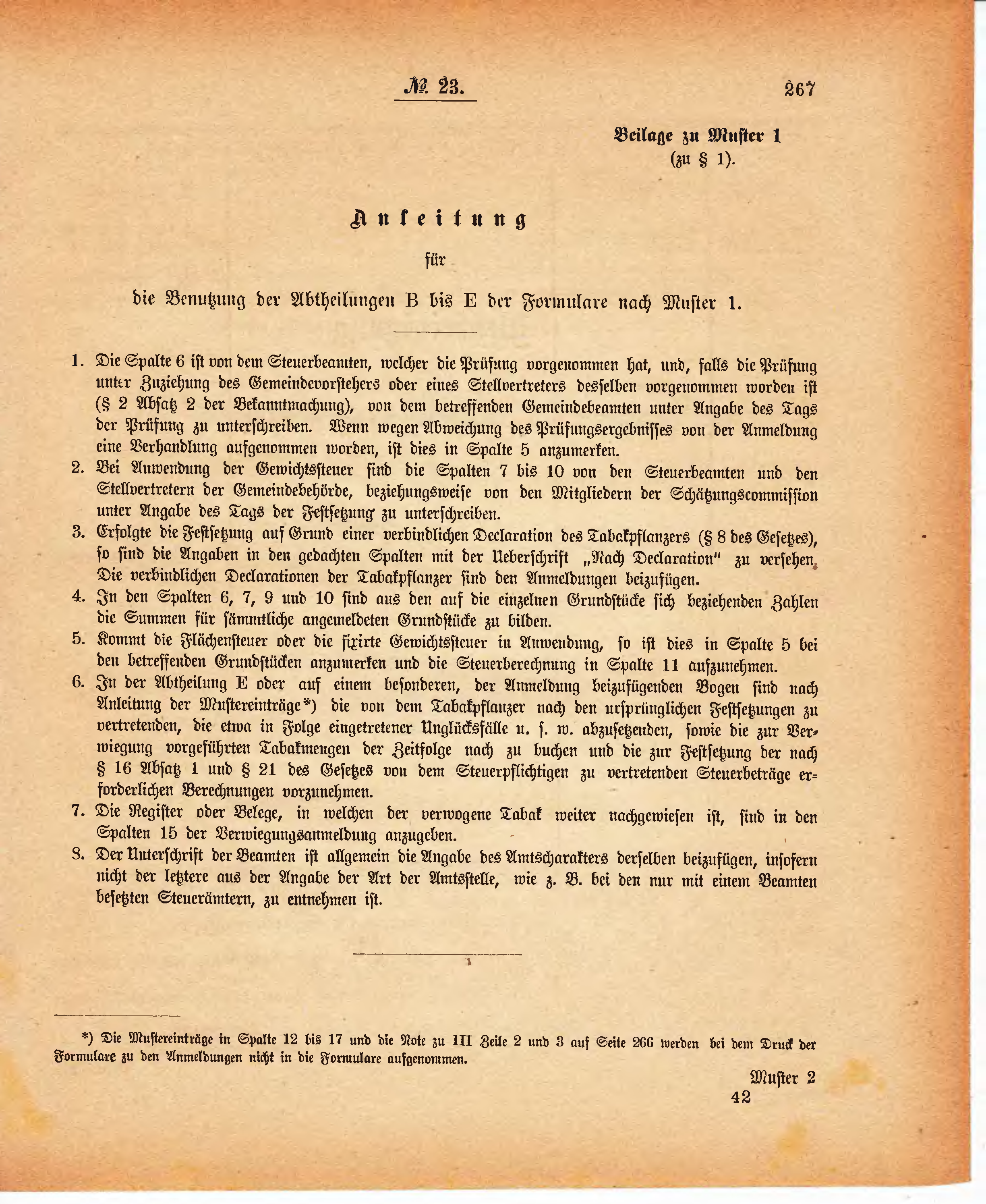 | 6. | In der Abtheilung E oder auf einem besonderen, der Anmeldung beizufügenden Bogen sind nach Anleitung der Mustereinträge*) die von dem Tabakpflanzer nach den ursprünglichen Festsetzungen zu vertretenden, die etwa in Folge eingetretener Unglücksfälle u. s. w. abzusetzenden, sowie die zur Verwiegung vorgeführten Tabakmengen der Zeitfolge nach zu buchen und die zur Festsetzung der nach § 16 Absatz 1 und § 21 des Gesetzes von dem Steuerpflichtigen zu vertretenden Steuerbeträge erforderlichen Berechnungen vorzunehmen. |