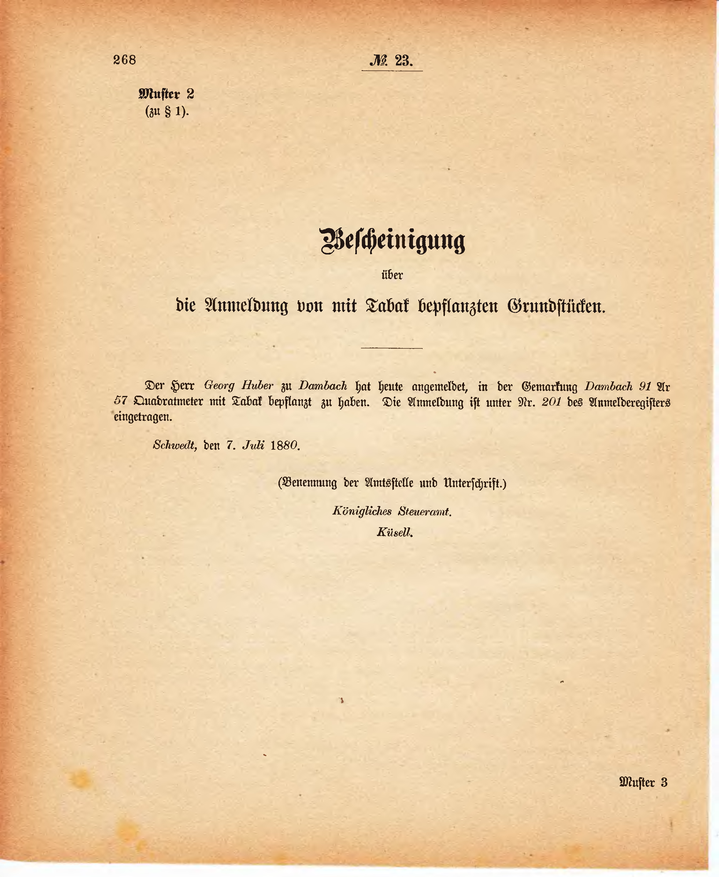 Der Herr Georg Huber[GWR 1] zu Dambach hat heute angemeldet, in der Gemarkung Dambach 91 Ar 57 Quadratmeter mit Tabak bepflanzt zu haben. Die Anmeldung ist unter Nr. 201 des Anmelderegisters eingetragen.
