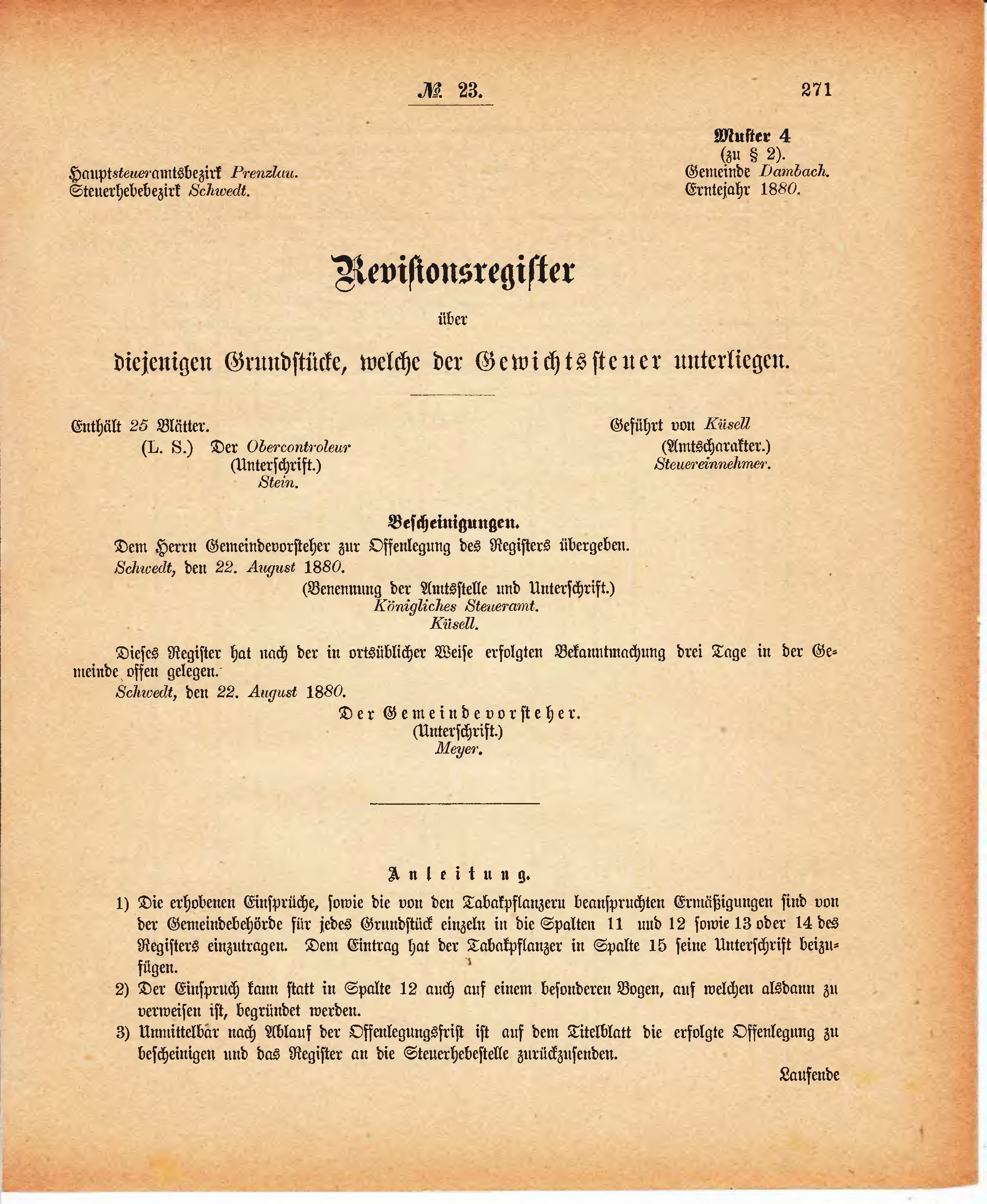 | Enthält 25 Blätter. (L. S.) Der Obercontroleur (Unterschrift.) Stein.[GWR 1] |