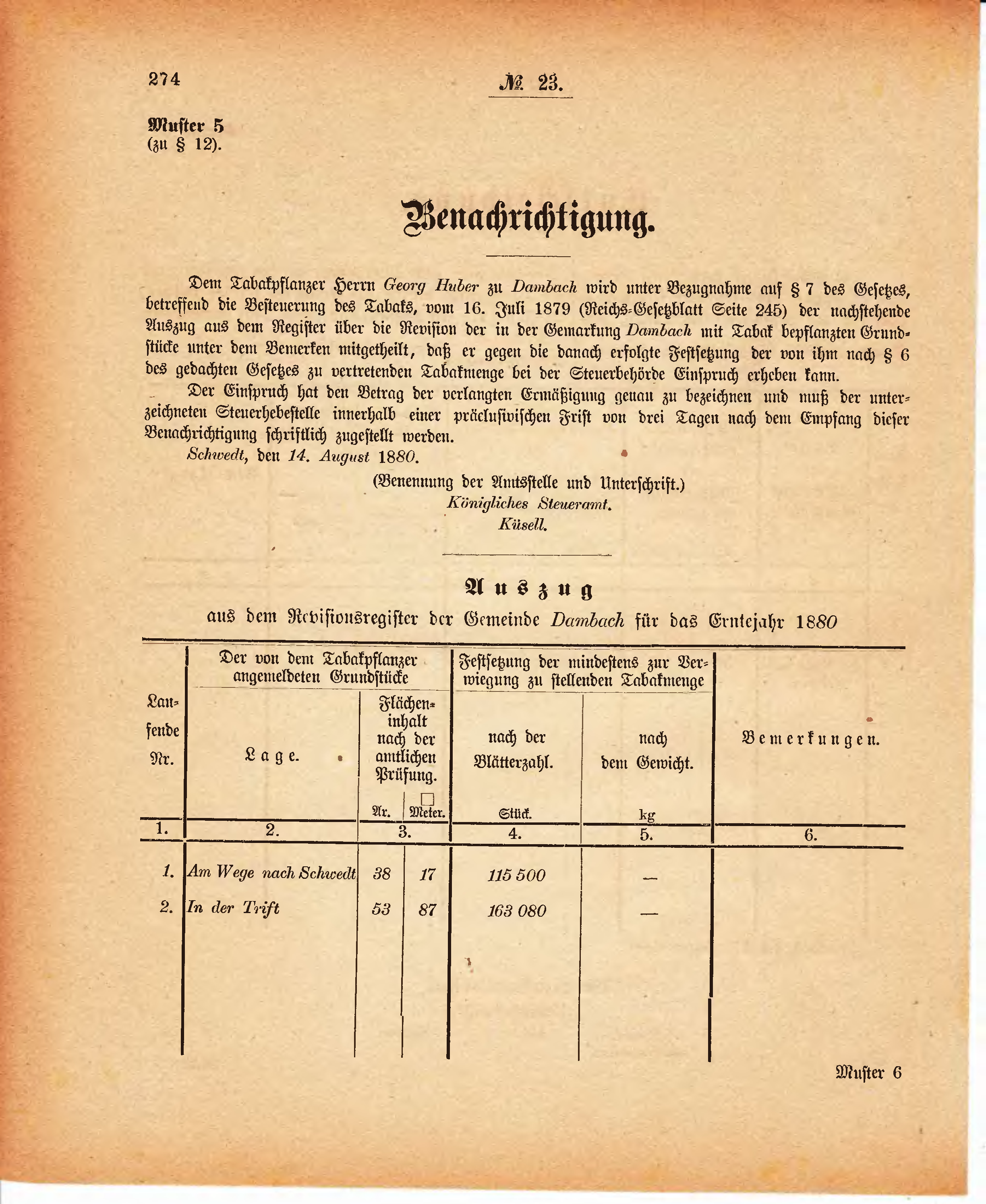 Dem Tabakpflanzer Herrn Georg Huber[GWR 1] zu Dambach wird unter Bezugnahme auf § 7 des Gesetzes, betreffend die Besteuerung des Tabaks, vom 16. Juli 1879 (Reichs-Gesetzblatt Seite 245) der nachstehende Auszug aus dem Register über die Revision der in der Gemarkung Dambach mit Tabak bepflanzten Grundstücke unter dem Bemerken mitgetheilt, daß er gegen die danach erfolgte Festsetzung der von ihm nach § 6 des gedachten Gesetzes zu vertretenden Tabakmenge bei der Steuerbehörde Einspruch erheben kann.