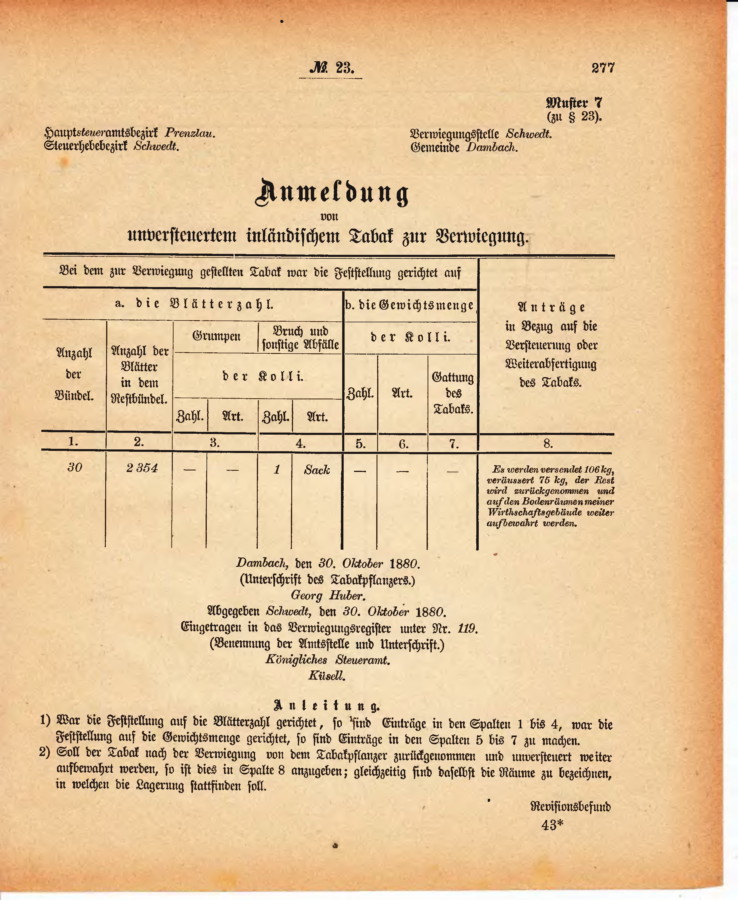 Abgegeben Schwedt, den 30. Oktober 1880.