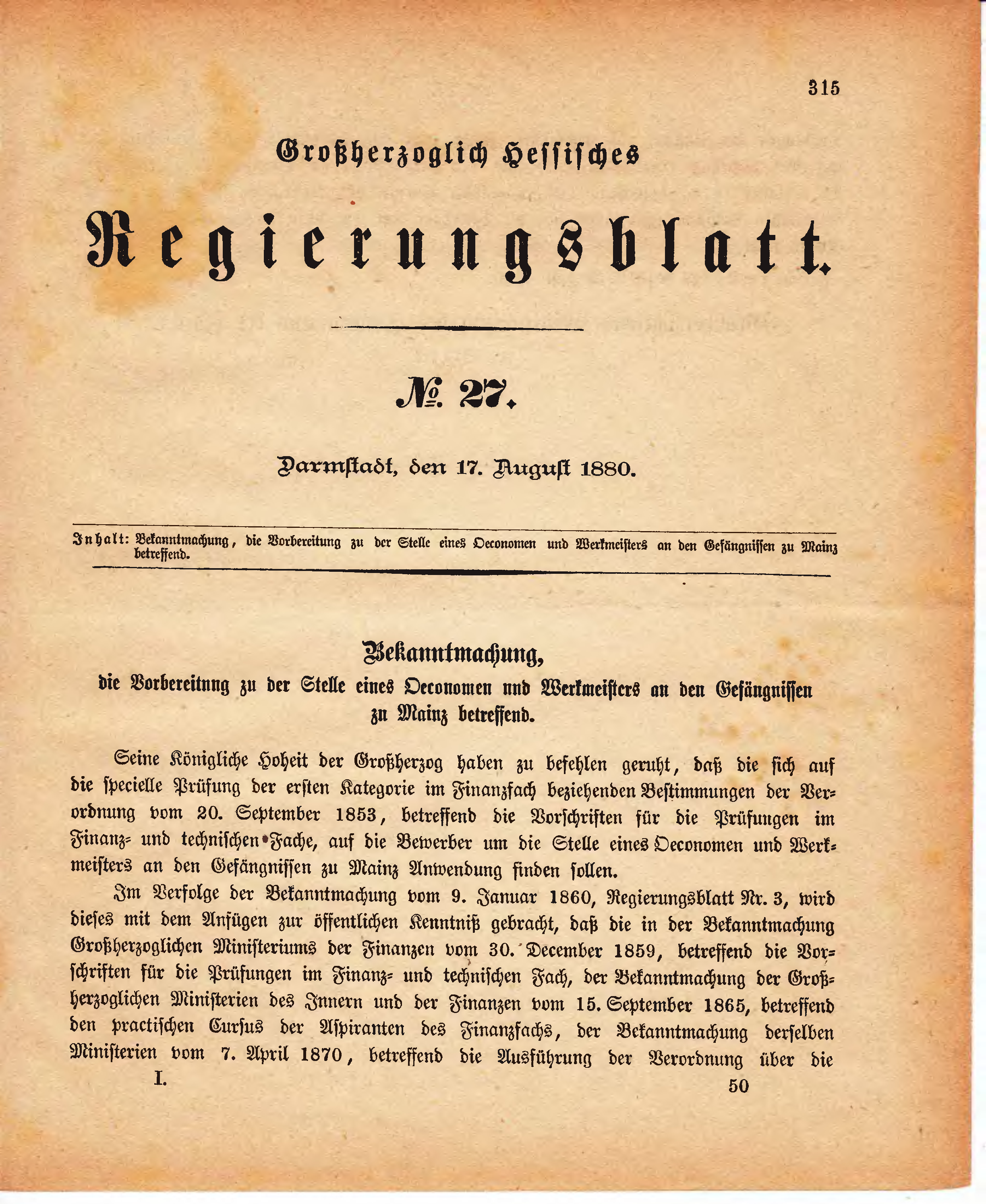 Seine Königliche Hoheit der Großherzog haben zu befehlen geruht, daß die sich auf die specielle Prüfung der ersten Kategorie im Finanzfach beziehenden Bestimmungen der Verordnung vom 20. September 1853, betreffend die Vorschriften für die Prüfungen im Finanz- und technischen Fache, auf die Bewerber um die Stelle eines Oeconomen und Werkmeisters an den Gefängnissen zu Mainz Anwendung finden sollen.