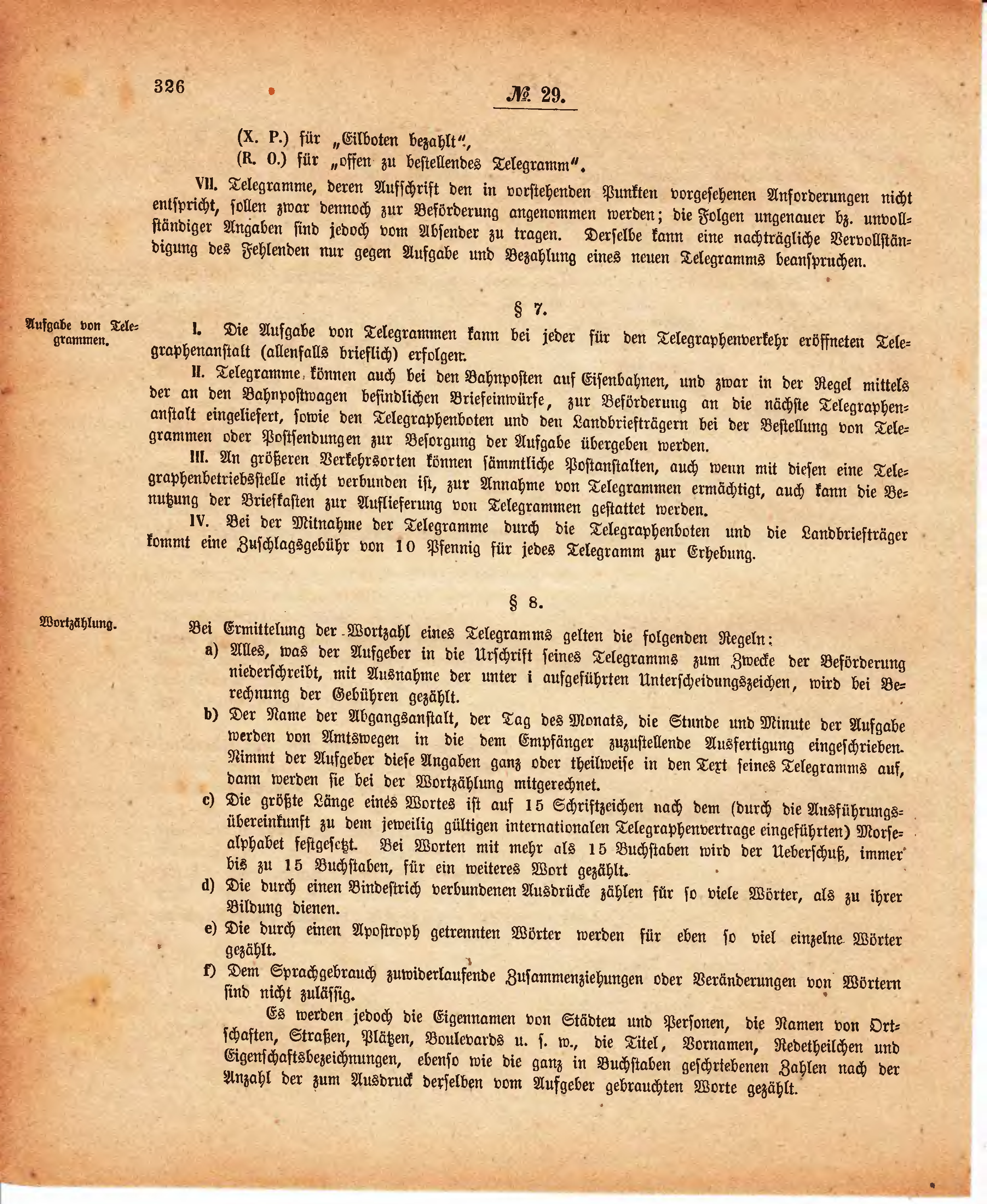 | IV. Bei der Mitnahme der Telegramme durch die Telegraphenboten und die Landbriefträger kommt eine Zuschlagsgebühr von 10 Pfennig für jedes Telegramm zur Erhebung. | |||