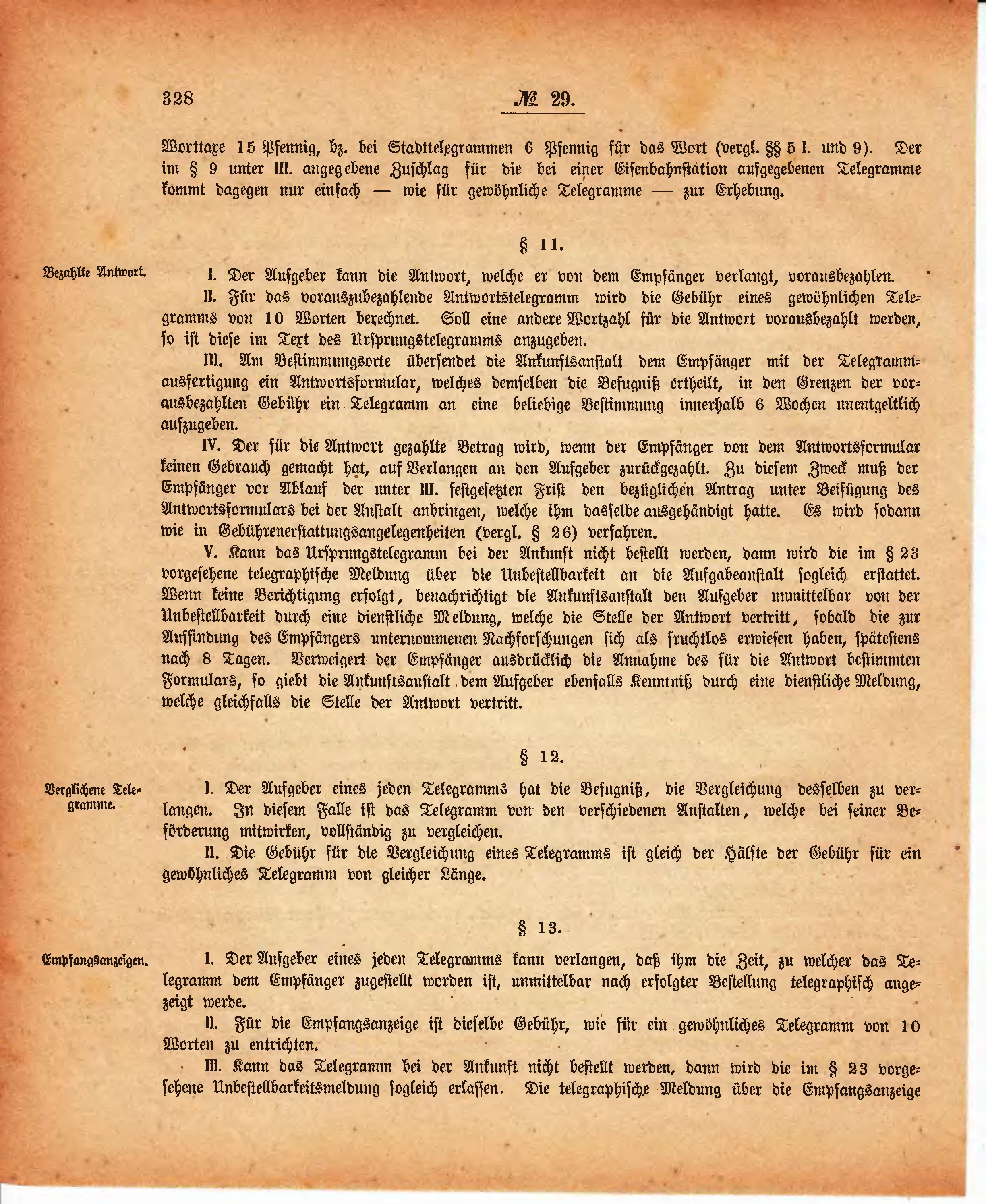 | II. Für die Empfangsanzeige ist dieselbe Gebühr, wie für ein gewöhnliches Telegramm von 10 Worten zu entrichten. | |