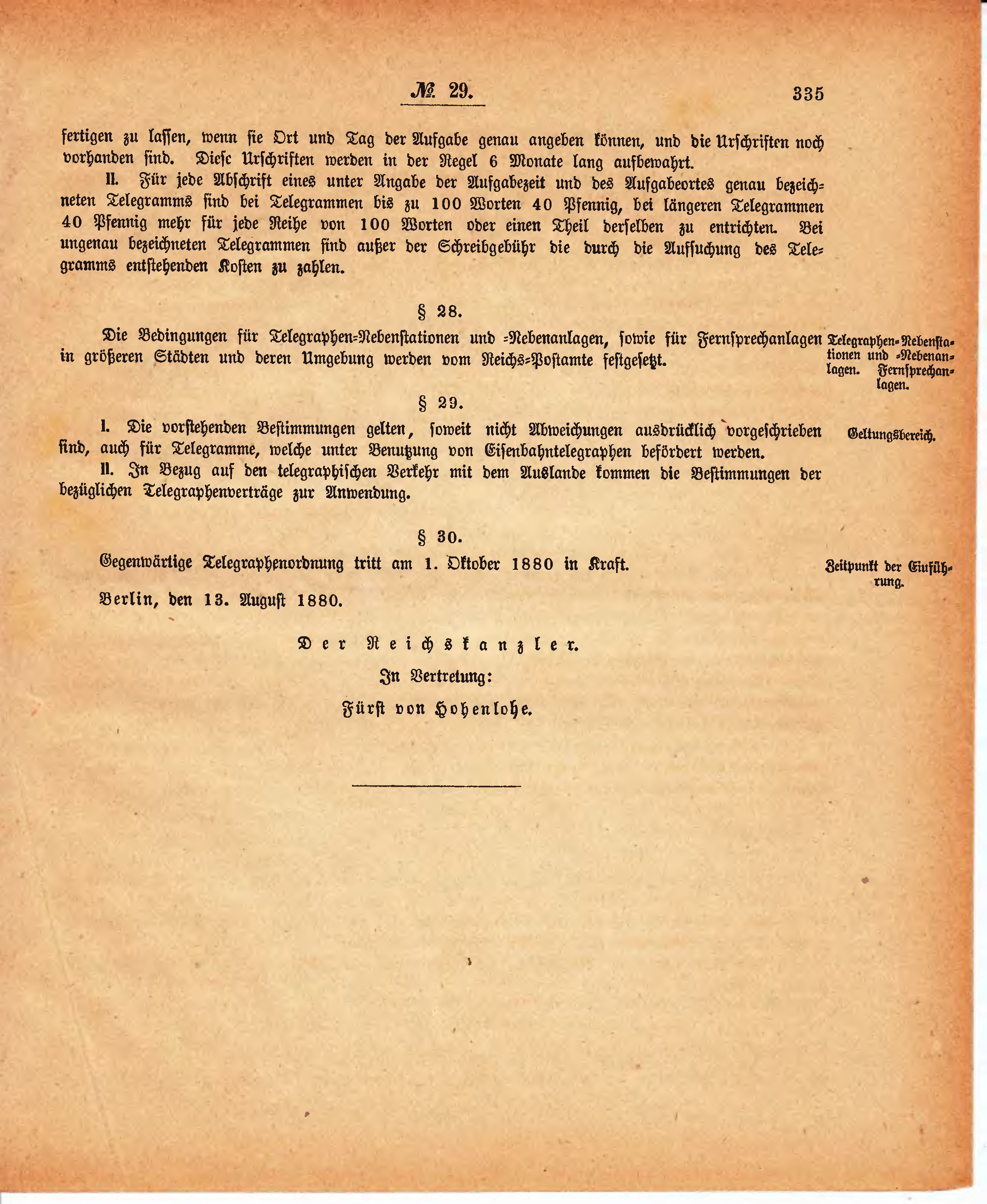 | Gegenwärtige Telegraphenordnung tritt am 1. Oktober 1880 in Kraft. | |