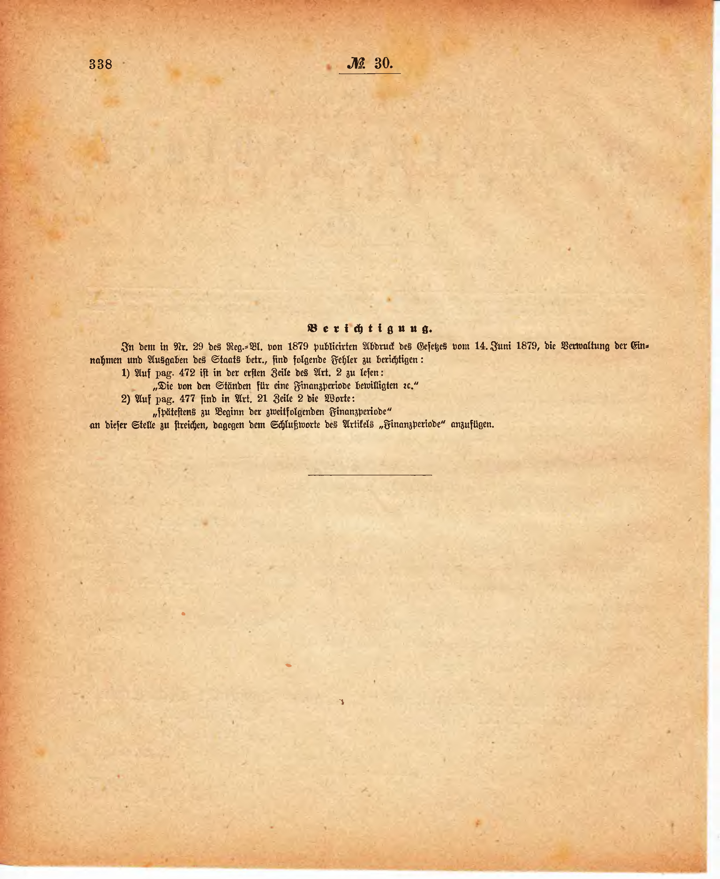 | In dem in Nr. 29 des Reg.-BI. von 1879 publicirten Abdruck des Gesetzes vom 14. Juni 1879, die Verwaltung der Einnahmen und Ausgaben des Staats betr., sind folgende Fehler zu berichtigen: | ||