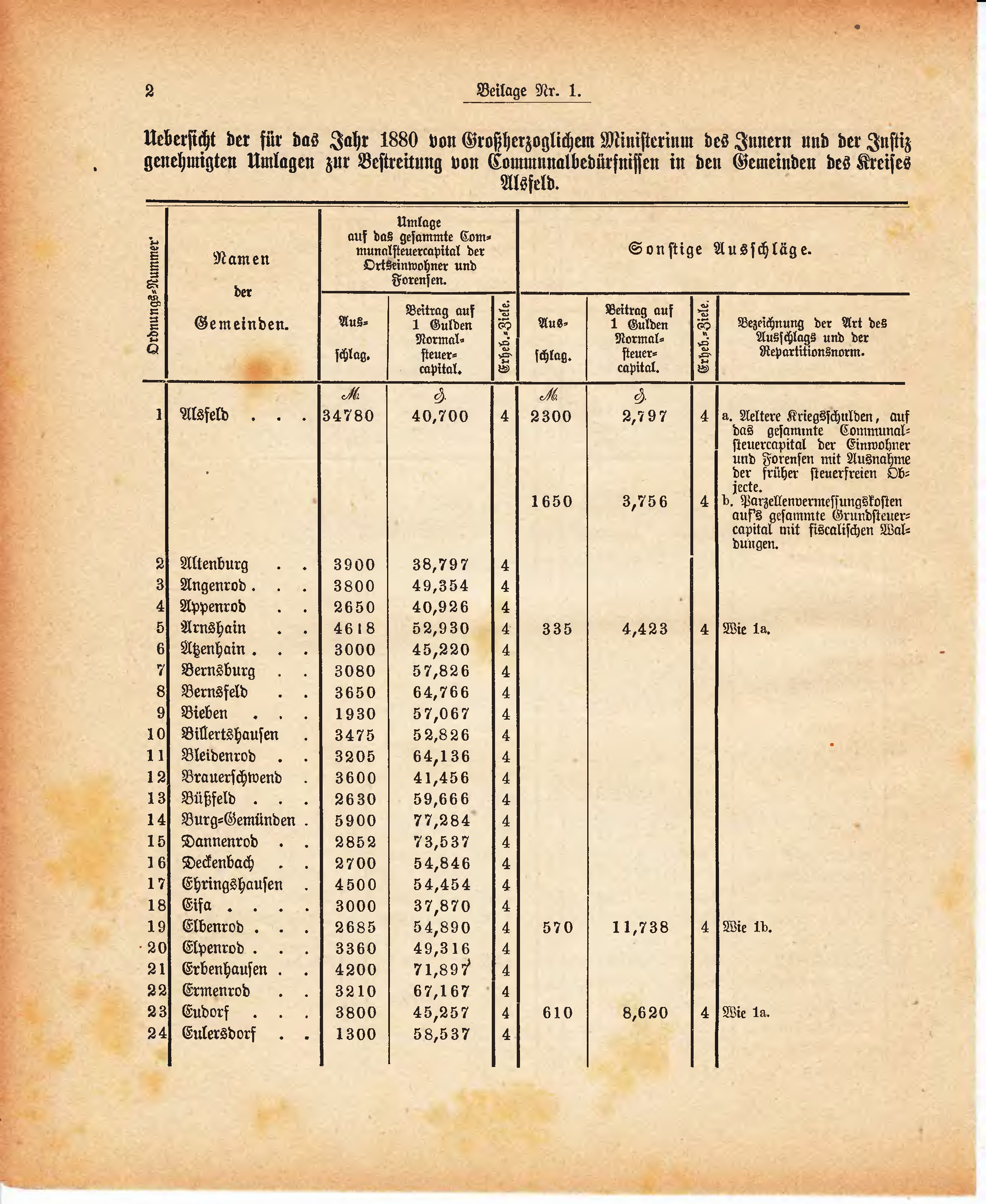 Uebersicht der für das Jahr 1880 von Großherzoglichem Ministerium des Innern und der Justiz genehmigten Umlagen zur Bestreitung von Communalbedürfnissen in den Gemeinden des Kreises Alsfeld.