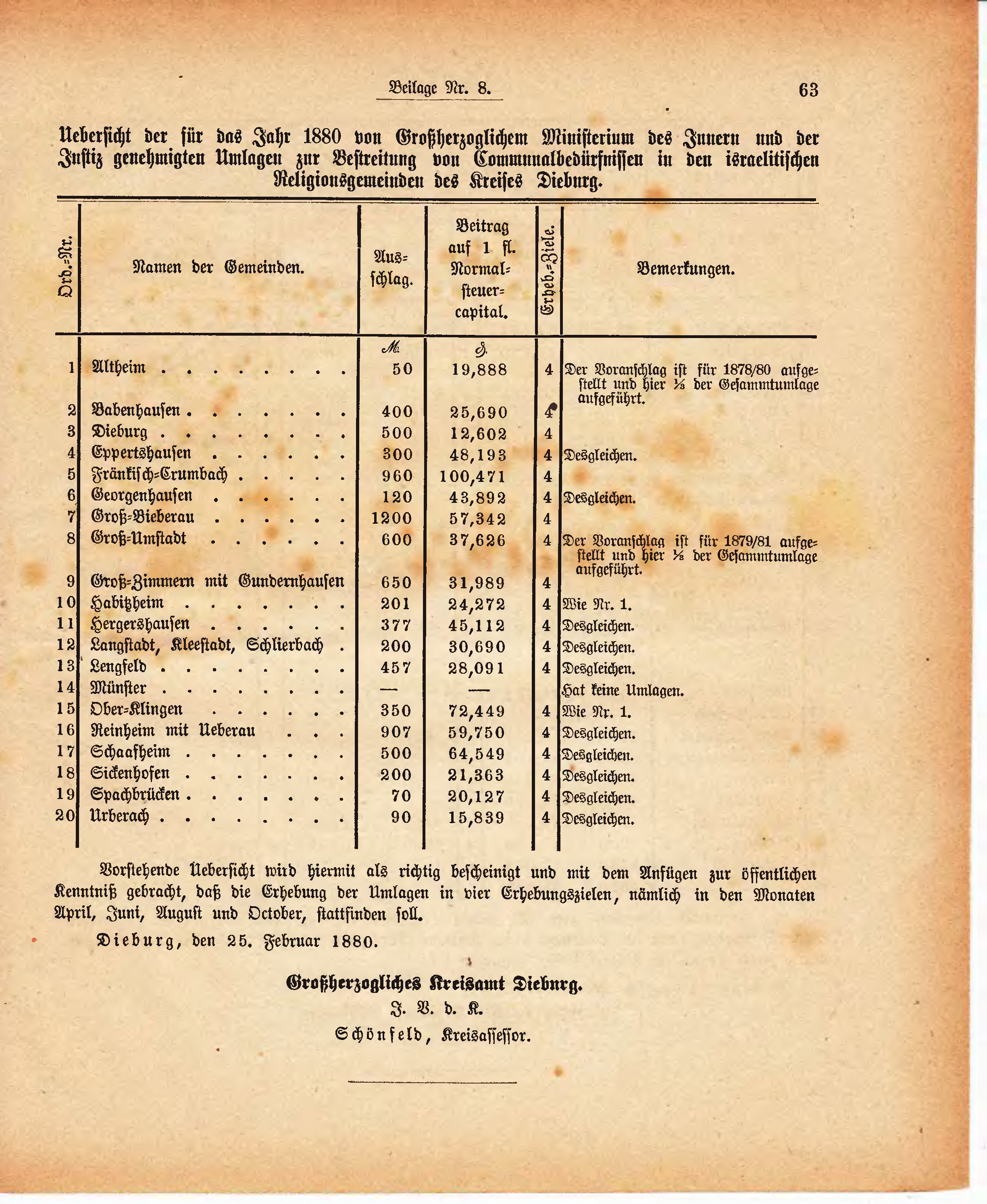 Uebersicht der für das Jahr 1880 von Großherzoglichem Ministerium des Innern und der Justiz genehmigten Umlagen zur Bestreitung von Communalbedürfnissen in den israelitischen Religionsgemeinden des Kreises Dieburg.