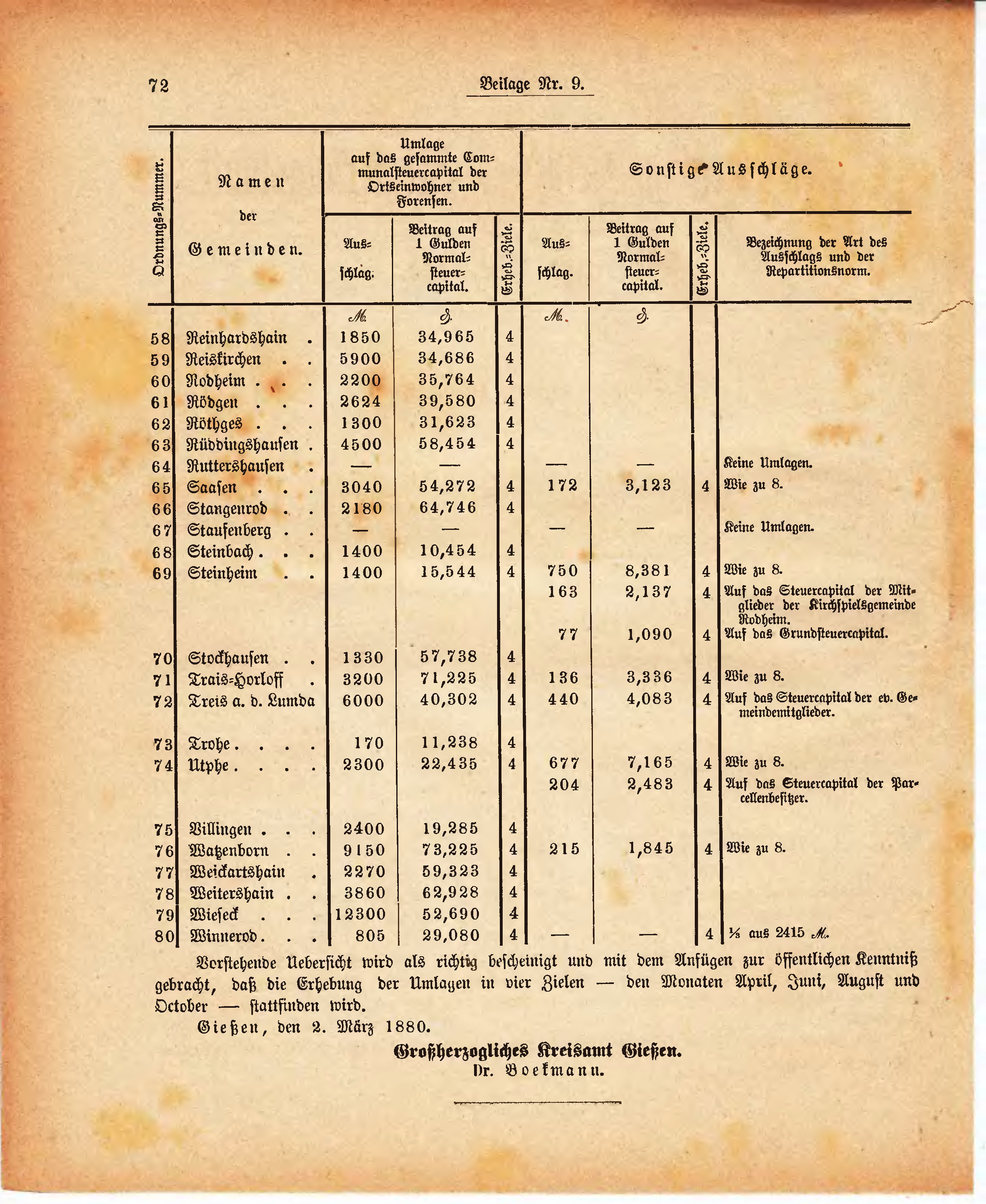 Vorstehende Uebersicht wird als richtig bescheinigt und mit dem Anfügen zur öffentlichen Kenntniß gebracht, daß die Erhebung der Umlagen in vier Zielen - den Monaten April, Juni, August und October - stattfinden wird.
