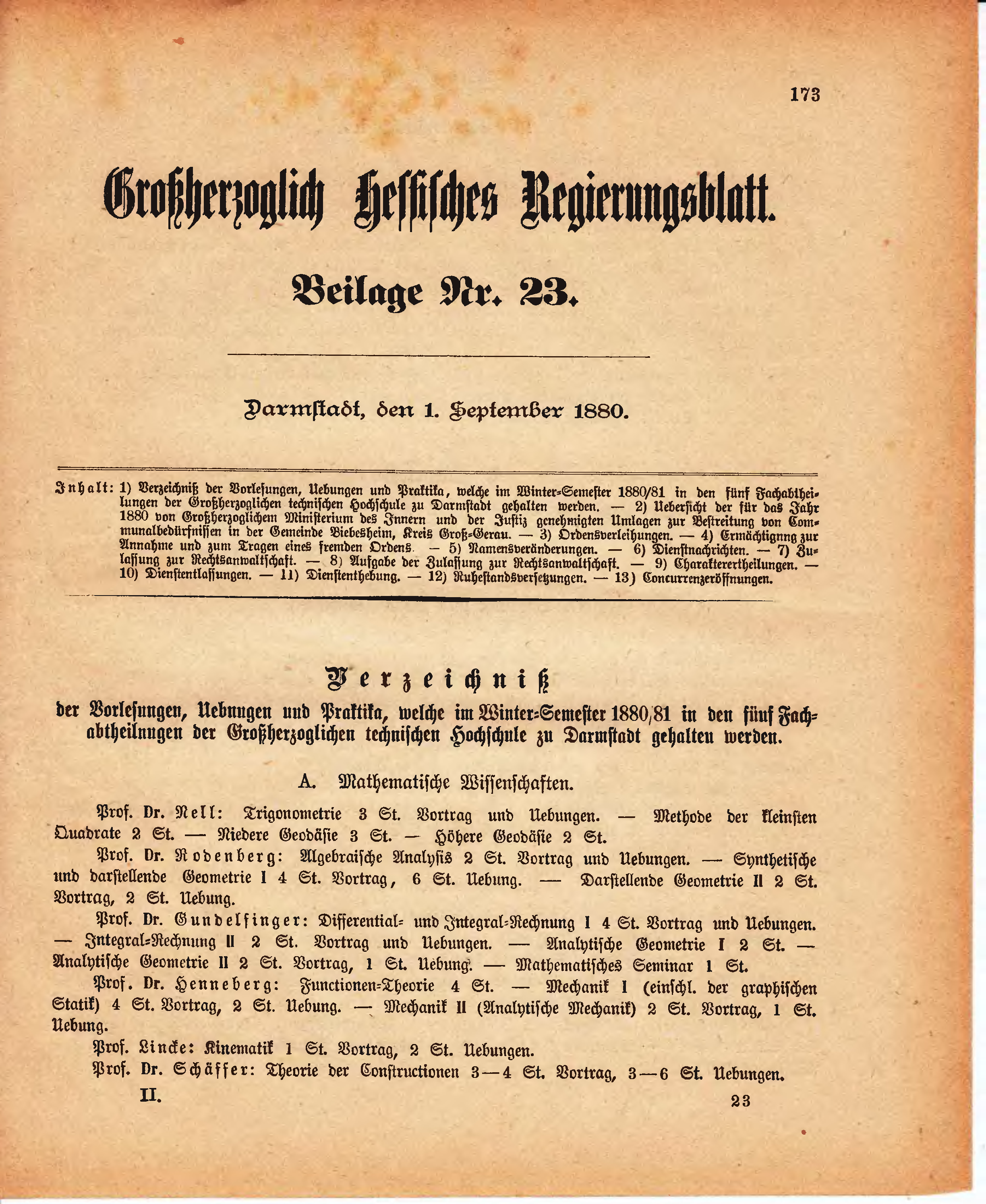 Inhalt: 1) Verzeichniß der Vorlesungen, Uebungen und Praktika, welche im Winter-Semester 1880/81 in den fünf Fachabtheilungen der Großherzoglichen technischen Hochschule zu Darmstadt gehalten werden. - 2) Uebersicht der für das Jahr 1880 von Großherzoglichem Ministerium des Innern und der Justiz genehmigten Umlagen zur Bestreitung von Communalbedürfnissen in der Gemeinde Biebesheim, Kreis Groß-Gerau. - 3) Ordensverleihungen. - 4) Ermächtigung zur Annahme und zum Tragen eines fremden Ordens. - 5) Namensveränderungen. - 6) Dienstnachrichten. - 7) Zulassung zur Rechtsanwaltschaft. - 8) Aufgabe der Zulassung zur Rechtsanwaltschaft. - 9) Charakterertheilungen. - 10) Dienstentlassungen. - 11) Dienstenthebung. - 12) Ruhestandsversetzungen. - 13) Concurrenzeröffnungen.