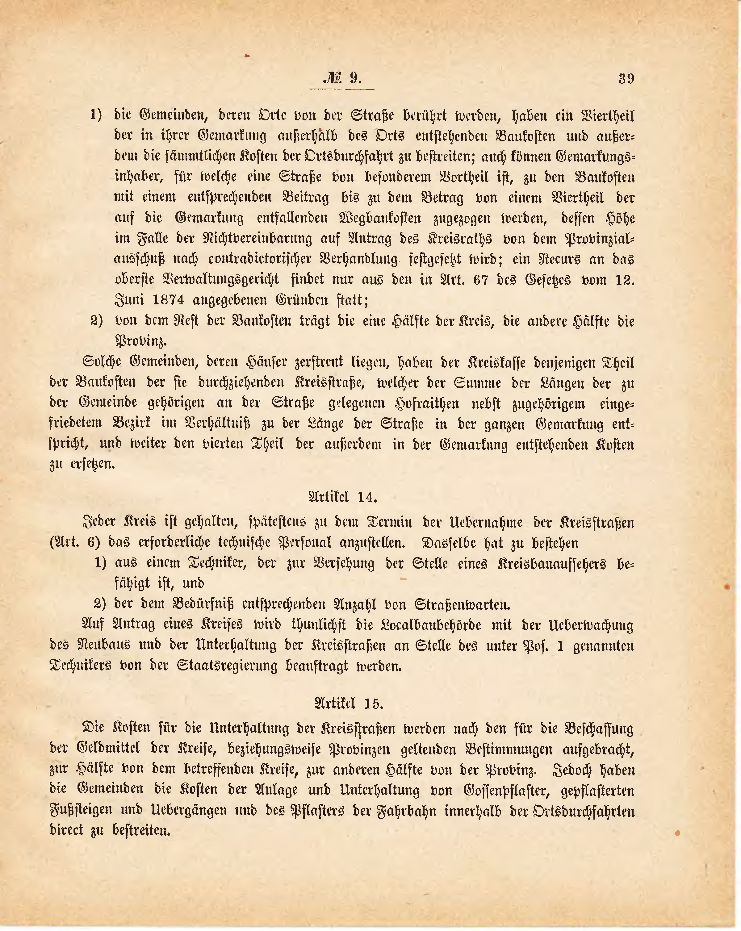 | 1) | die Gemeinden, deren Orte von der Straße berührt werden, haben ein Viertheil der in ihrer Gemarkung außerhalb des Orts entstehenden Baukosten und außerdem die sämmtlichen Kosten der Ortsdurchfahrt zu bestreiten; auch können Gemarkungsinhaber, für welche eine Straße von besonderem Vortheil ist, zu den Baukosten mit einem entsprechenden Beitrag bis zu dem Betrag von einem Viertheil der auf die Gemarkung entfallenden Wegbaukosten zugezogen werden, dessen Höhe im Falle der Nichtvereinbarung auf Antrag des Kreisraths von dem Provinzialausschuß nach contradictorischer Verhandlung festgesetzt wird; ein Recurs an das oberste Verwaltungsgericht findet nur aus den in Art. 67 des Gesetzes vom 12. Juni 1874 angegebenen Gründen statt; | |