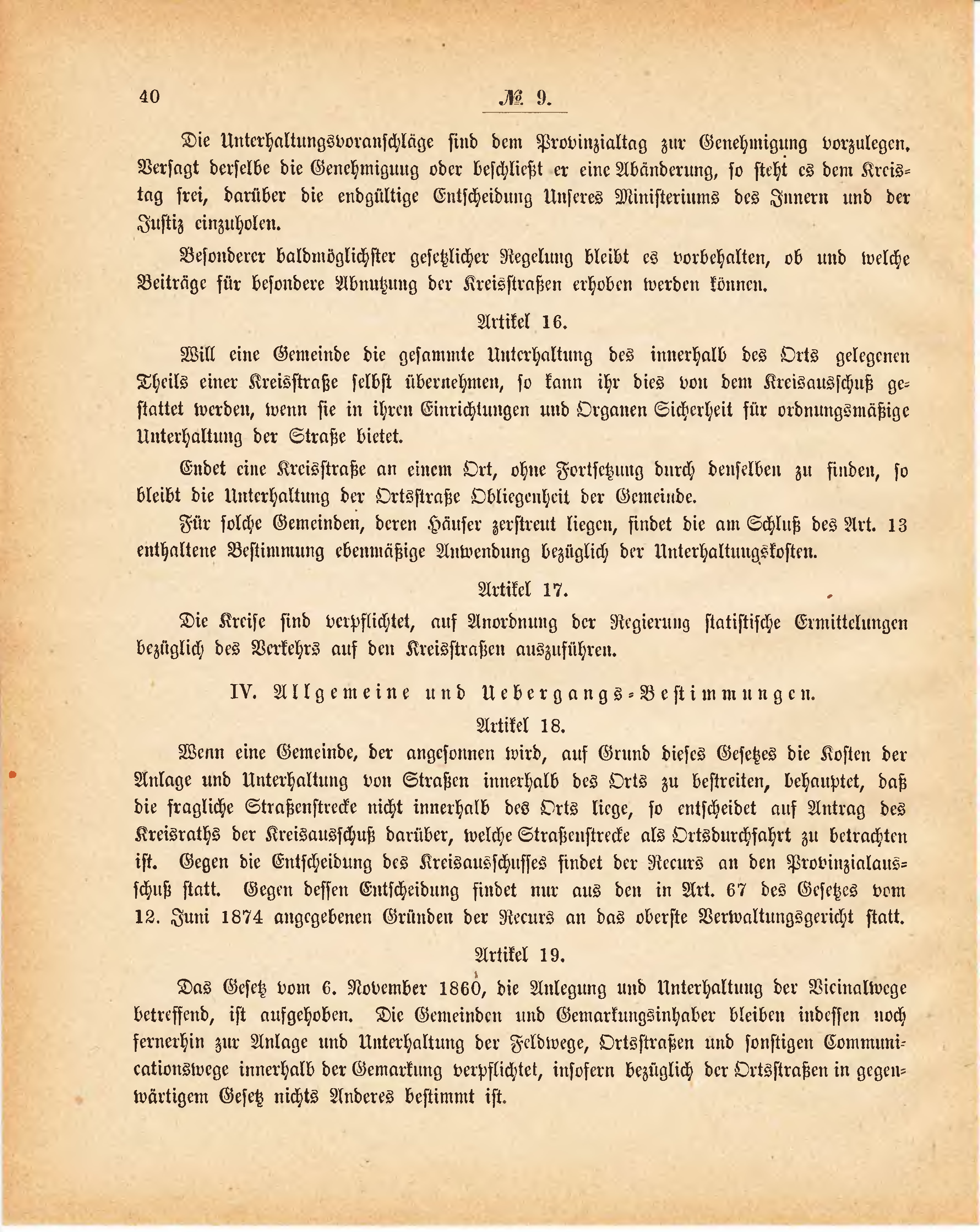 Das Gesetz vom 6. November 1860, die Anlegung und Unterhaltung der Vicinalwege betreffend, ist aufgehoben. Die Gemeinden und Gemarkungsinhaber bleiben indessen noch fernerhin zur Anlage und Unterhaltung der Feldwege, Ortsstraßen und sonstigen Communicationswege innerhalb der Gemarkung verpflichtet, insofern bezüglich der Ortsstraßen in gegenwärtigem Gesetz nichts Anderes bestimmt ist.