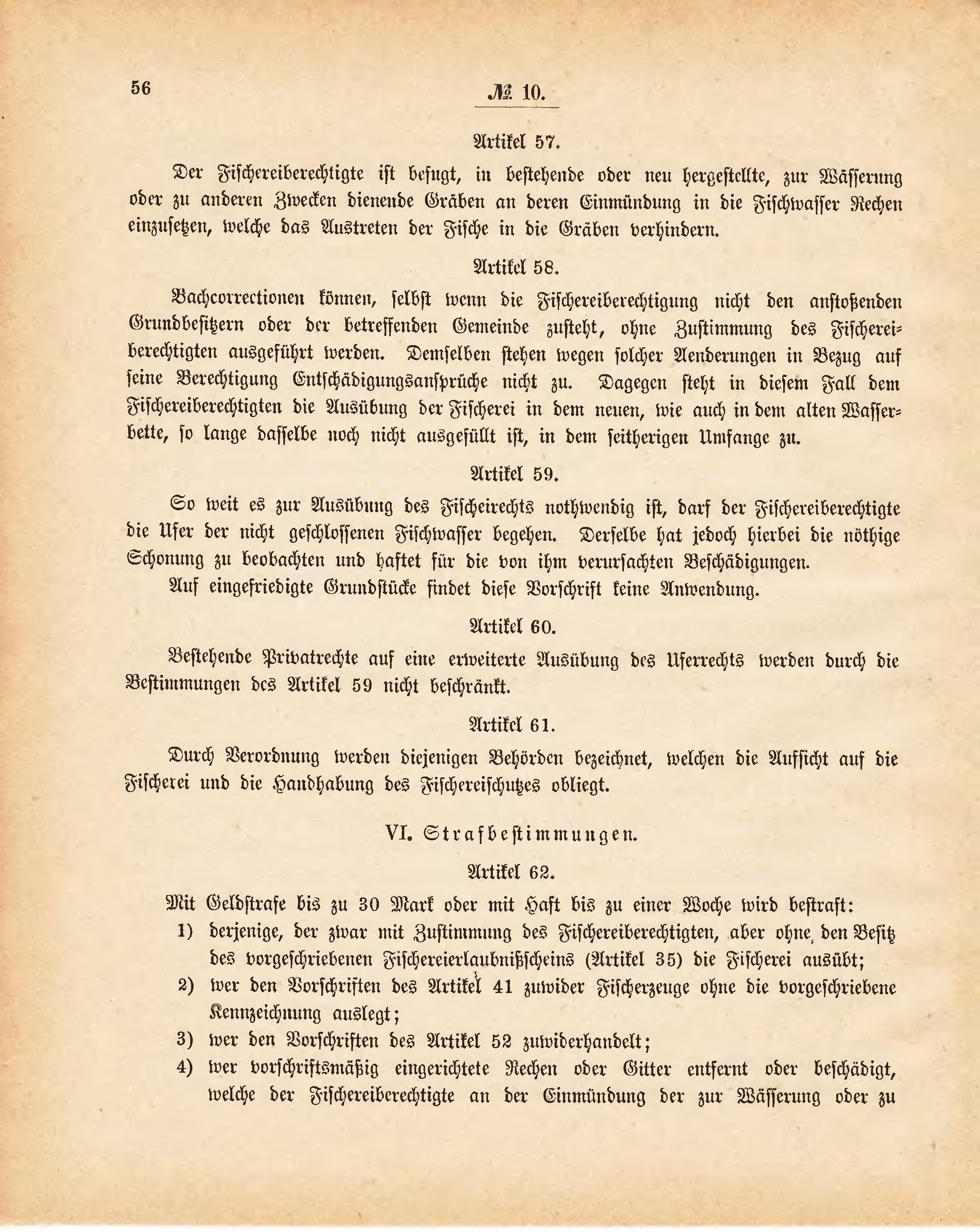 Der Fischereiberechtigte ist befugt, in bestehende oder neu hergestellte, zur Wässerung oder zu anderen Zwecken dienende Gräben an deren Einmündung in die Fischwasser Rechen einzusetzen, welche das Austreten der Fische in die Gräben verhindern.