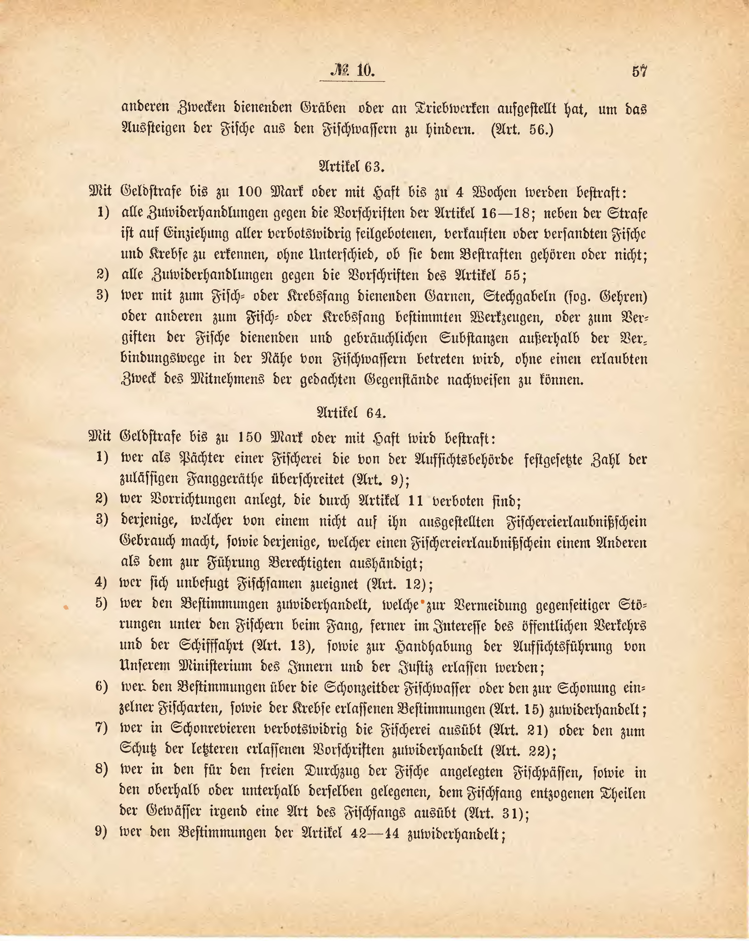 | anderen Zwecken dienenden Gräben oder an Triebwerken aufgestellt hat, um das Aussteigen der Fische aus den Fischwassern zu hindern. (Art. 56.) |