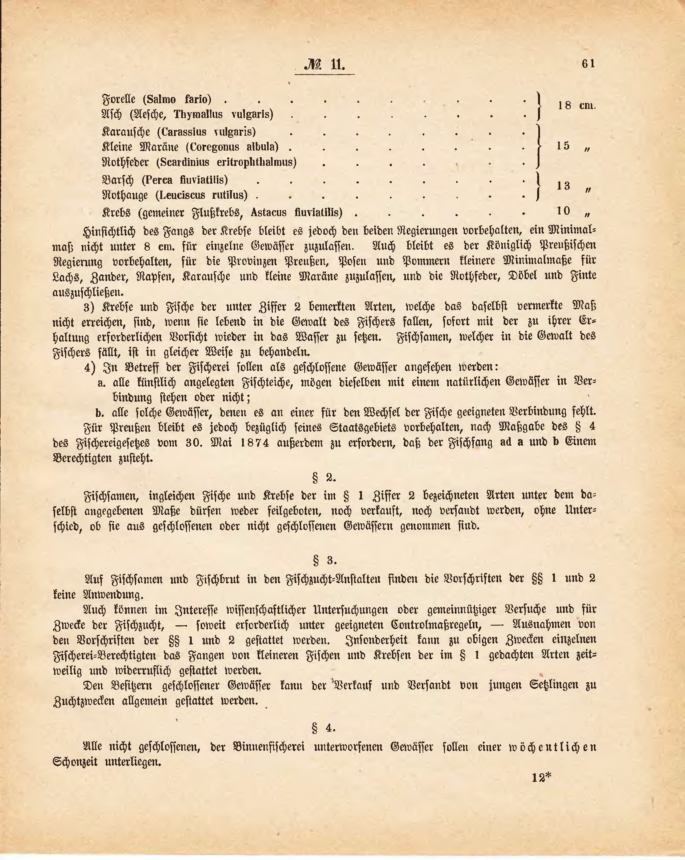 Hinsichtlich des Fangs der Krebse bleibt es jedoch den beiden Regierungen vorbehalten, ein Minimalmaß nicht unter 8 cm. für einzelne Gewässer zuzulassen. Auch bleibt es der Königlich Preußischen Regierung vorbehalten, für die Provinzen Preußen, Posen und Pommern kleinere Minimalmaße für Lachs, Zander, Rapsen, Karausche und kleine Maräne zuzulassen, und die Rothfeder, Döbel und Finte auszuschließen.