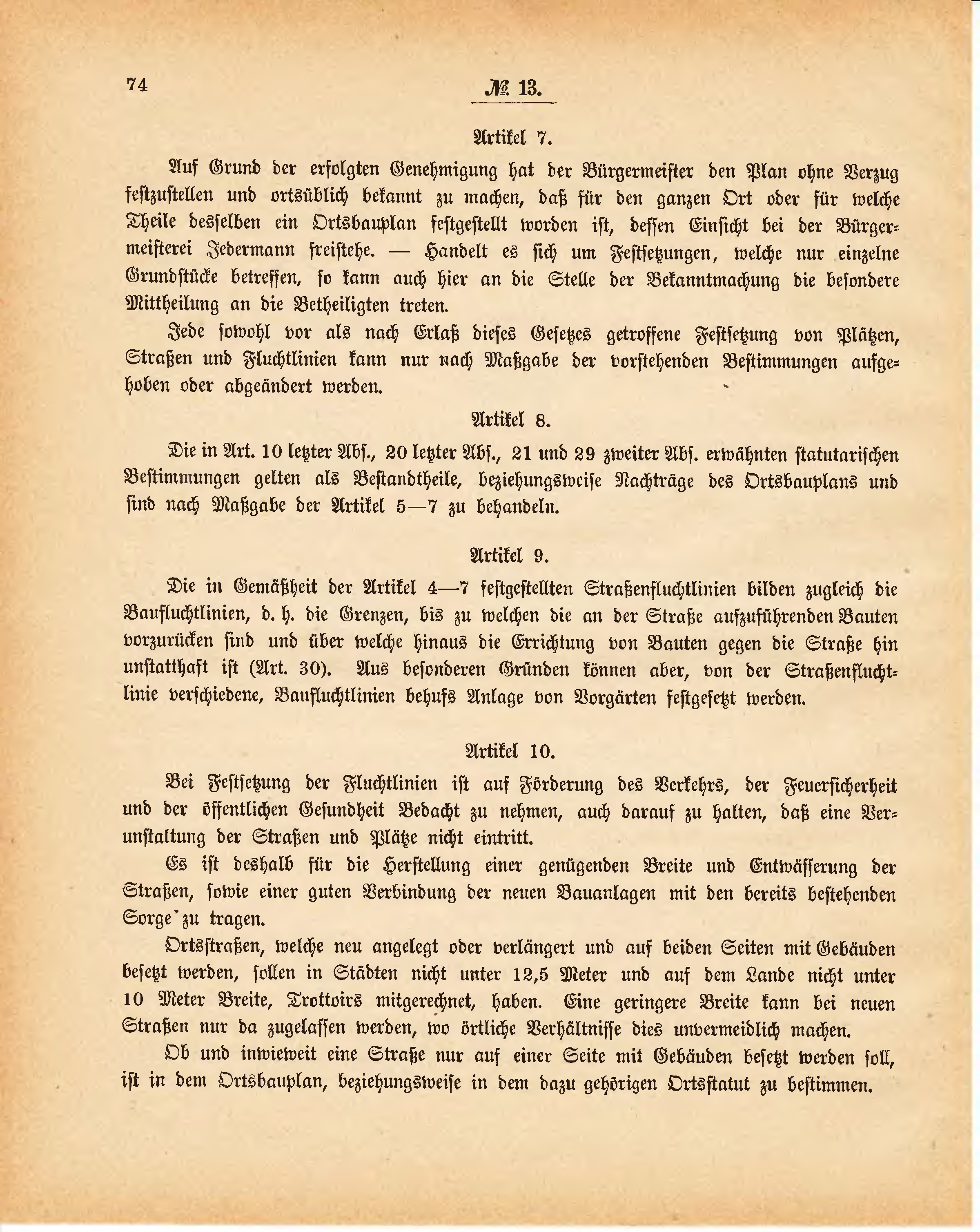 Ortsstraßen, welche neu angelegt oder verlängert und auf beiden Seiten mit Gebäuden besetzt werden, sollen in Städten nicht unter 12,5 Meter und auf dem Lande nicht unter 10 Meter Breite, Trottoirs mitgerechnet, haben. Eine geringere Breite kann bei neuen Straßen nur da zugelassen werden, wo örtliche Verhältnisse dies unvermeidlich machen.