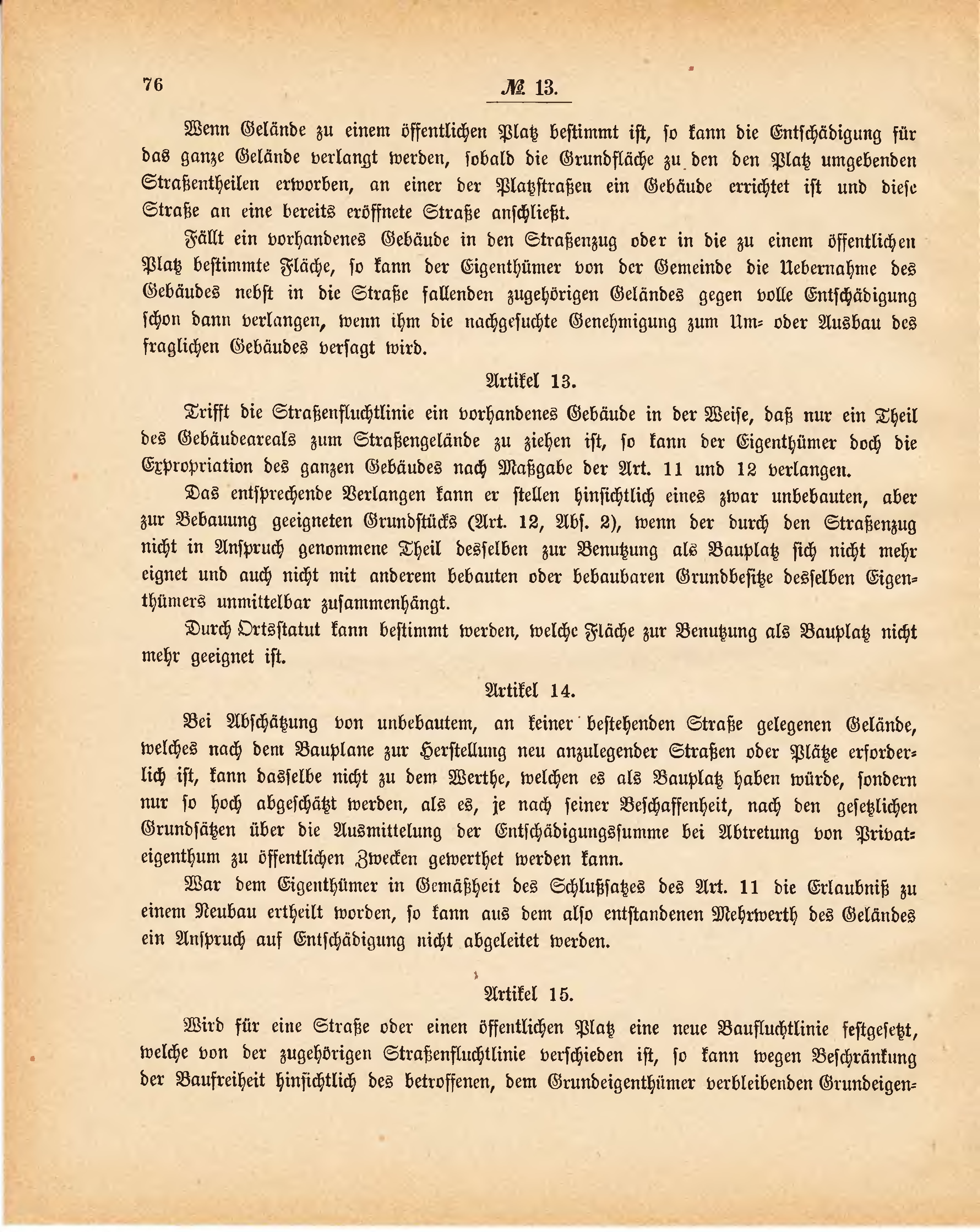 Das entsprechende Verlangen kann er stellen hinsichtlich eines zwar unbebauten, aber zur Bebauung geeigneten Grundstücks (Art. 12, Abs. 2), wenn der durch den Straßenzug nicht in Anspruch genommene Theil desselben zur Benutzung als Bauplatz sich nicht mehr eignet und auch nicht mit anderem bebauten oder bebaubaren Grundbesitze desselben Eigenthümers unmittelbar zusammenhängt.
